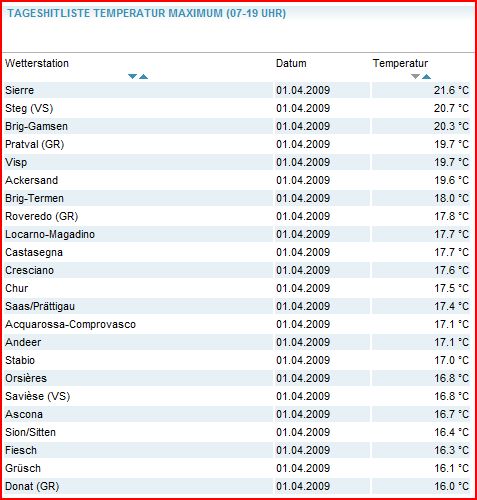 Nachfolgend noch die Hitlisten der Tmax vom Mittwoch: