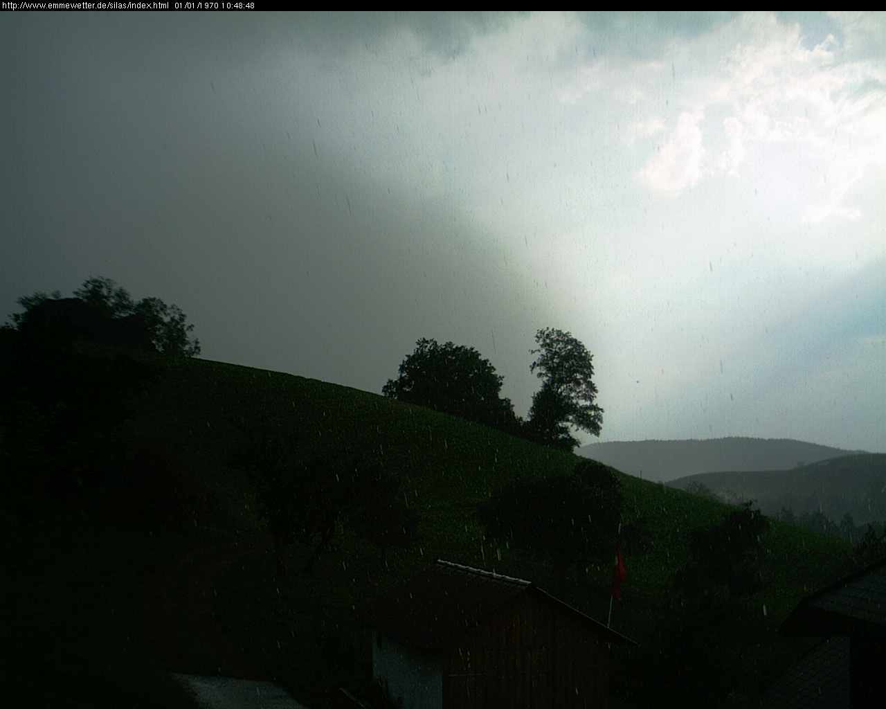 Heute hatten Säschu und ich ein absolut geniales Chasing. Mehr dazu später. Nun habe ich kurz meine Webcambilder gesichert und musste doch etwas stutzen, als ich die folgenden Bilder gesehen hatte. Man beachte inbesonderen den "Zwerg" - Baum etwas rechts der Bildmitte sowie die Fahne. Innerhalb einer Minute fielen 3,2mm Niederschlag (http://emmewetter.de/silas/wswin/20100714.gif). Interessanterweise gibt die Davis bei der Niederschlagsrate "nur" 124,4mm/h an - da geht etwas nicht auf. Am 23. Juli 2009 fielen maximal 2,8mm pro Minute (http://emmewetter.de/silas/wswin/20090723.gif), wobei die Niederschlagsrate auf über 800mm/h angegeben wurde. Extrem war es heute allemal, jedenfalls finde ich, dass die Webcambilder für sich sprechen.