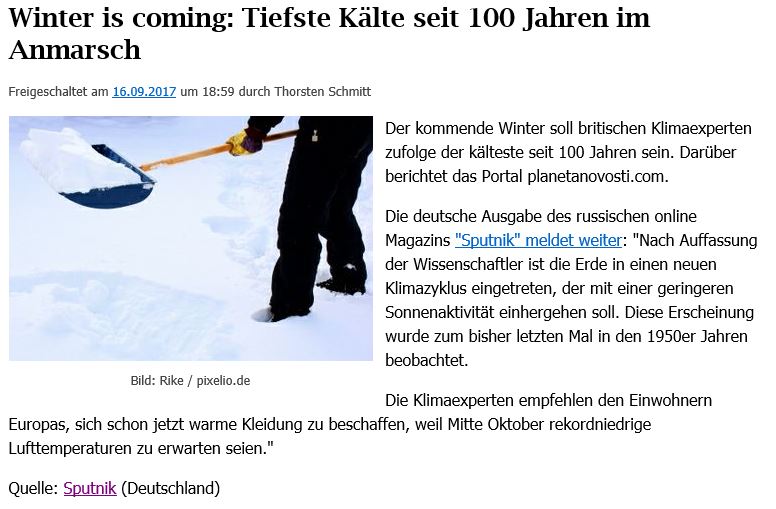 Gab es eigentlich schon mal ein Jahr, in dem die "britischen Klimaexperten" keinen Rekordwinter erwartet haben? Vor zwei Jahren waren es die Zwergschwäne, letztes Jahr der frühe Schneefall in Sibirien und weil das alles nicht hingehauen hat, muss jetzt die Sonne herhalten. Bin schon jetzt gespannt wie ein Londoner Regenschirm, was sie nächstes Jahr aus dem Hut zaubern.