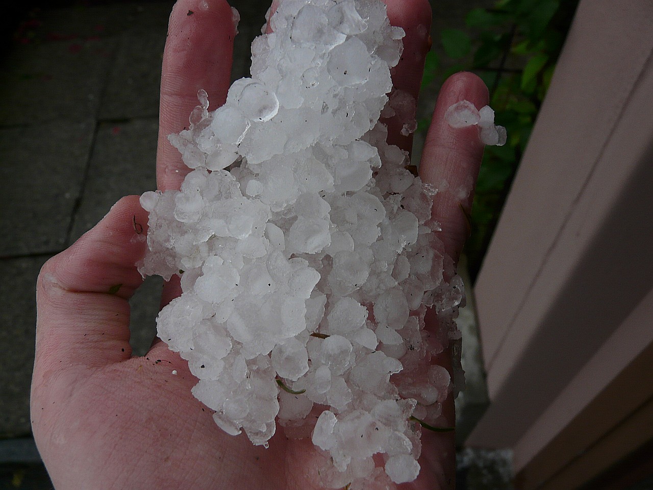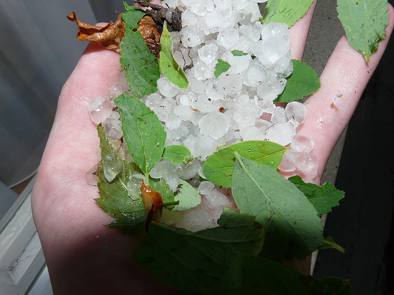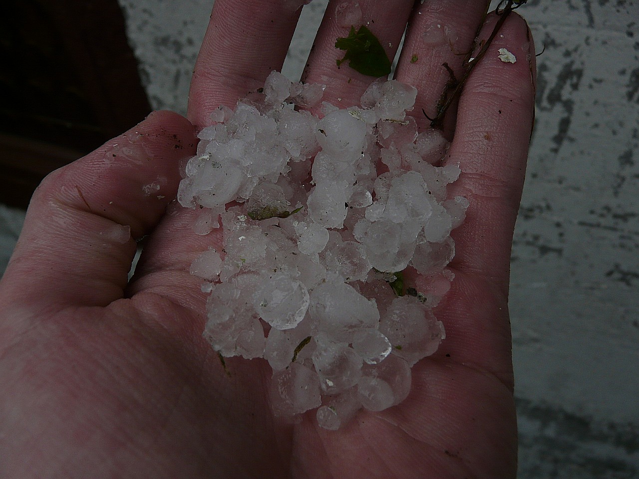Wollte gerade meine Mittagspause beenden als das ganze hier aus Richtung Bern aufzog. Erst rabenschwarze Wand und dahinter dann eine giftgrüne Wolke. Danach setzte dann auch sofort ordentlich Niederschlag ein der zunehmend in Hagel überging. Der Hagelschlag dauerte ca. 5 Minuten! mit bis zu 2,5 - 3 cm grossem Hagel. Mein Regenmesser zeigte mir dann auch eine stündliche Regenrate von bis zu 250 l/m²