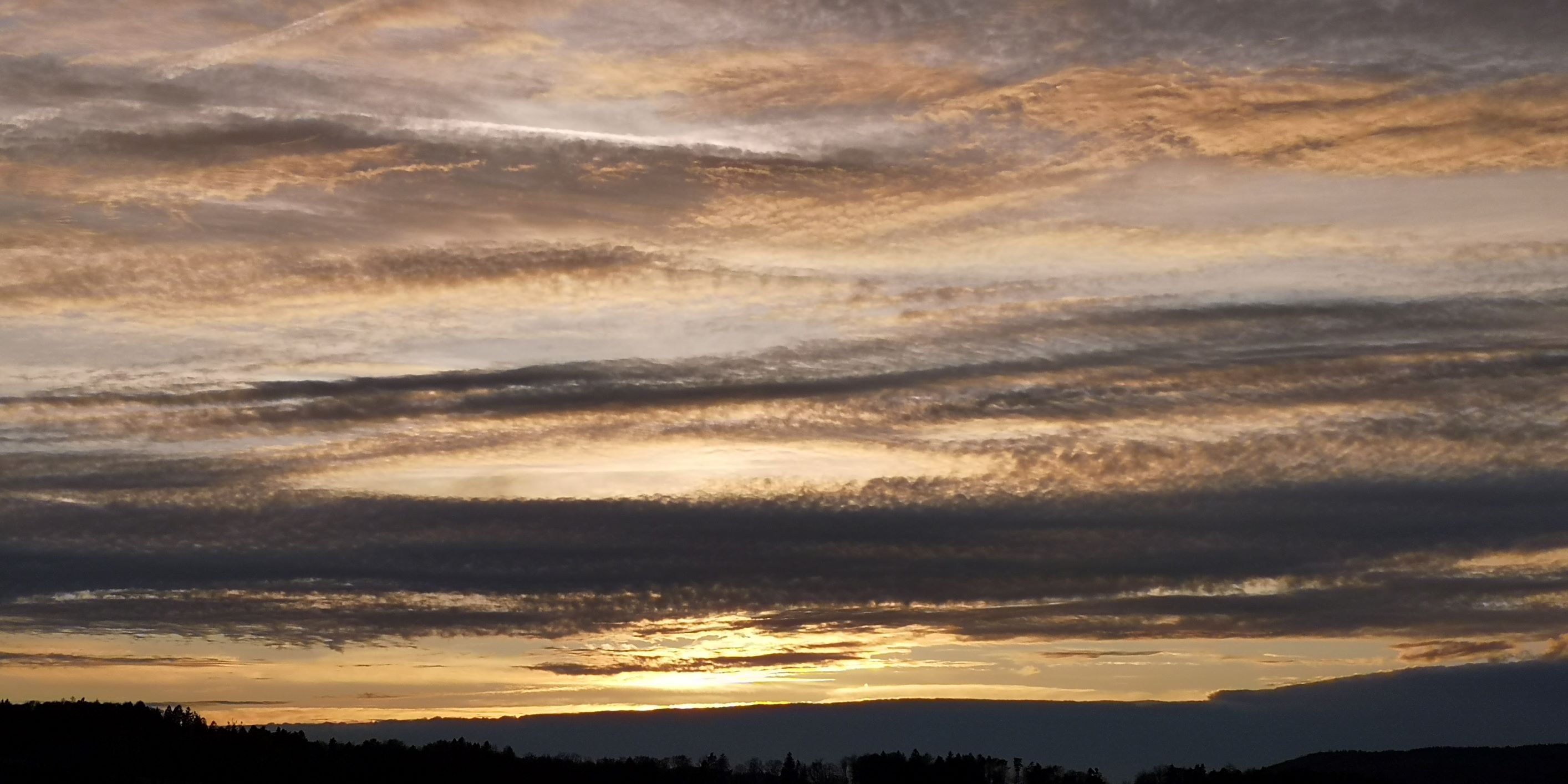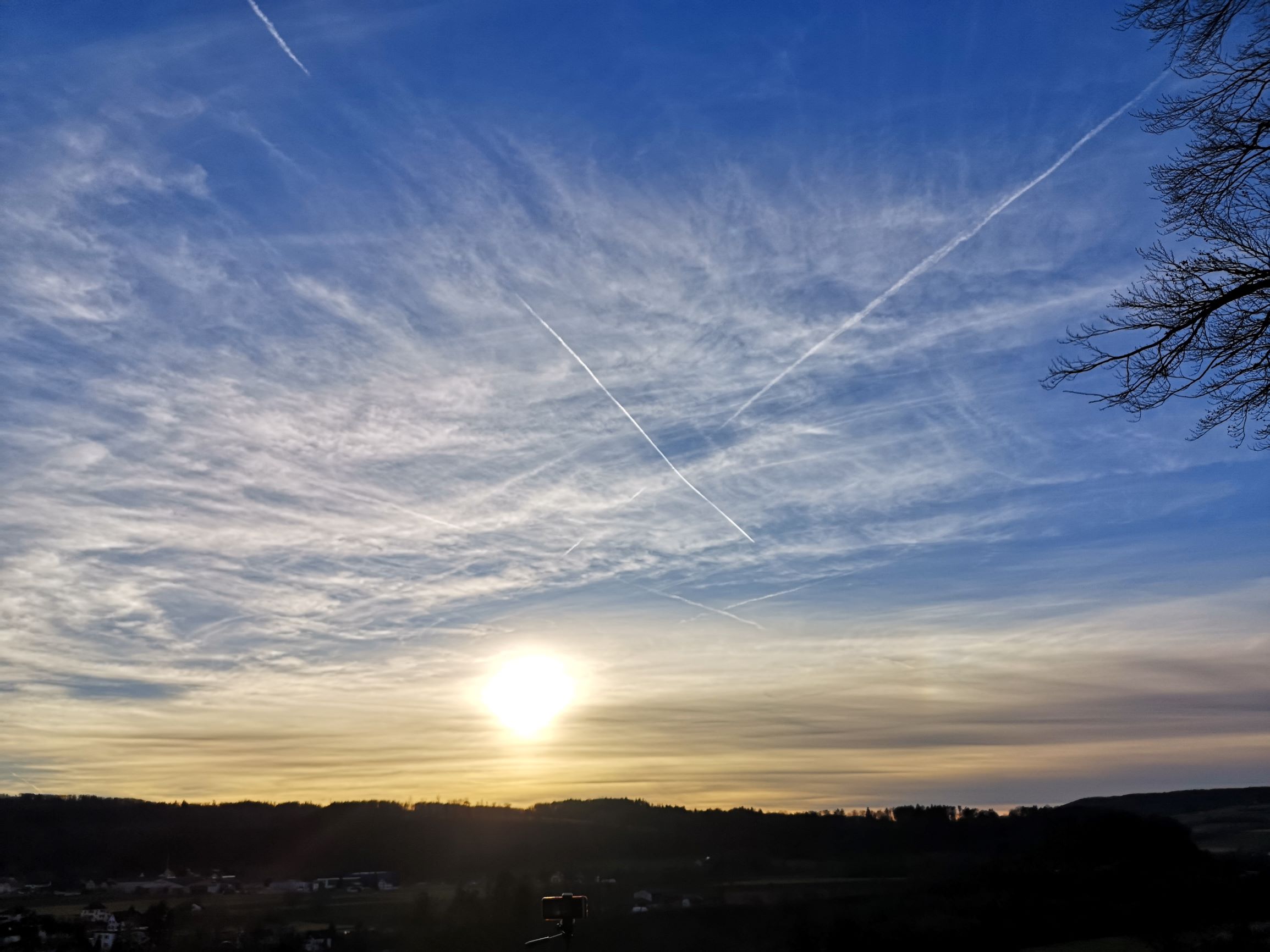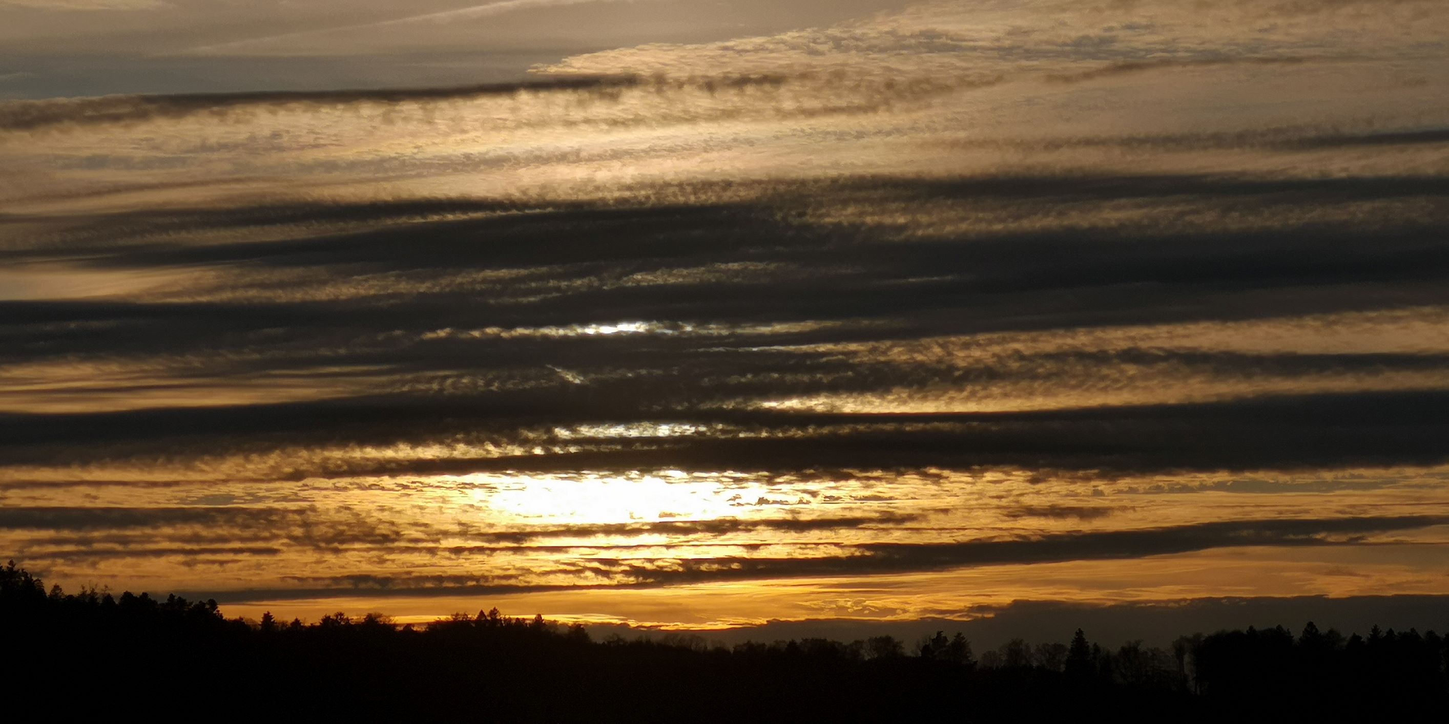 Nach den vielen Halos tagsüber am 8.3.2020 war der Abendhimmel nicht weniger spektakulär. Nicht wegen den unscheinbaren und kaum sichtbaren Nebensonnen, sondern wegen der Streifenoptik Fast wie mit dem Pinsel gemalt: