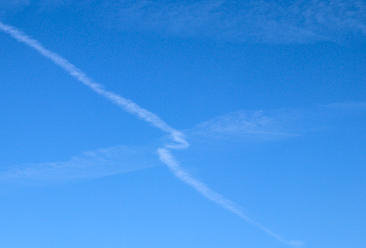 Kondensstreifen mit Bruch im Bereich starker horizontaler Windscherung. Das dürfte dort ordentlich geschüttelt haben.