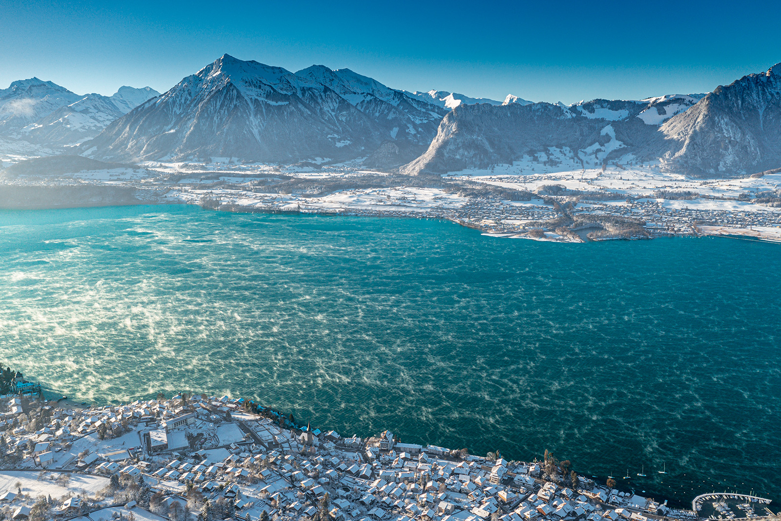 Der Wind wehte am Morgen vorübergehend aus Nordwest (abgelenkte Bise) und trieb sehr kalte Luft auf den Thunersee. Seerauch war die Folge.