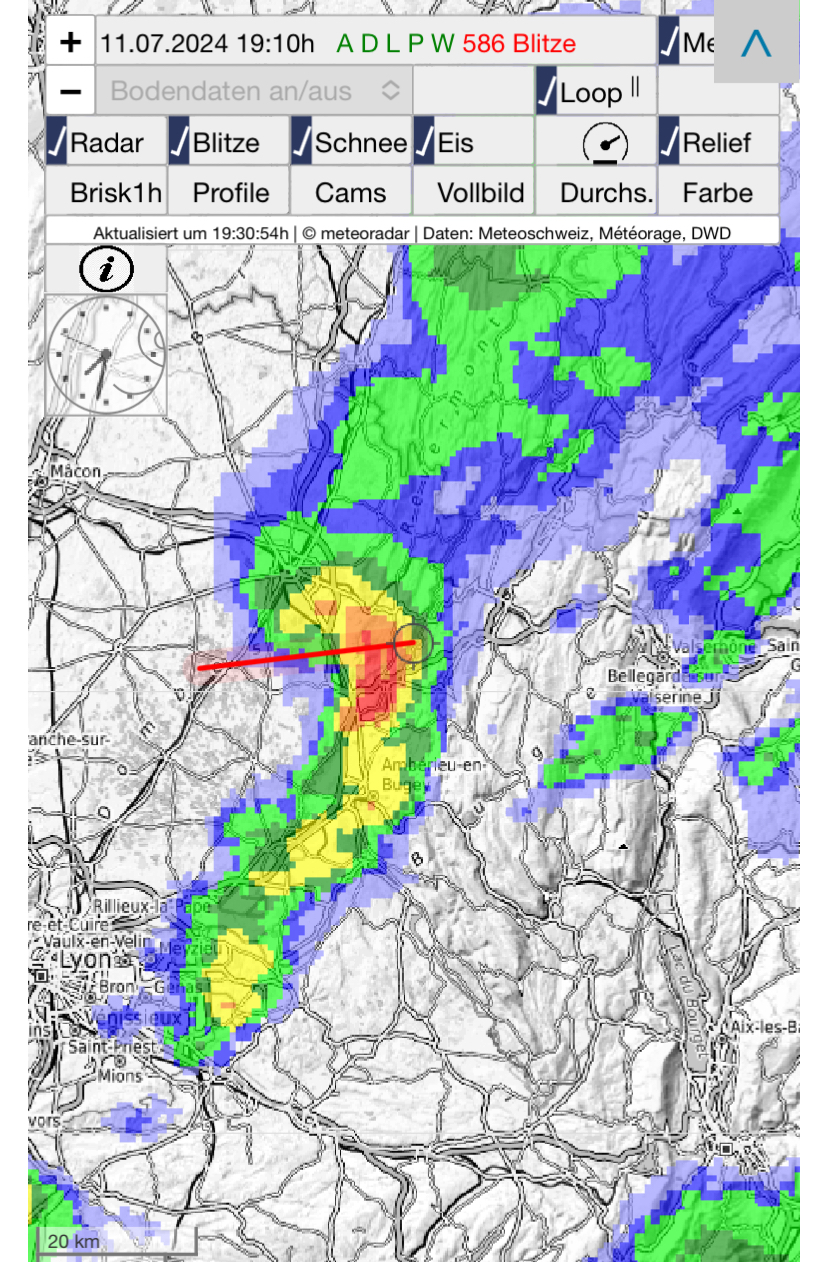 Hier hat eine blitztechnisch recht aktive Zelle kurz mit Donnern angeklopft, die zieht aber im Süden des Glarnerlands durch und scheint uns nicht zu treffen.