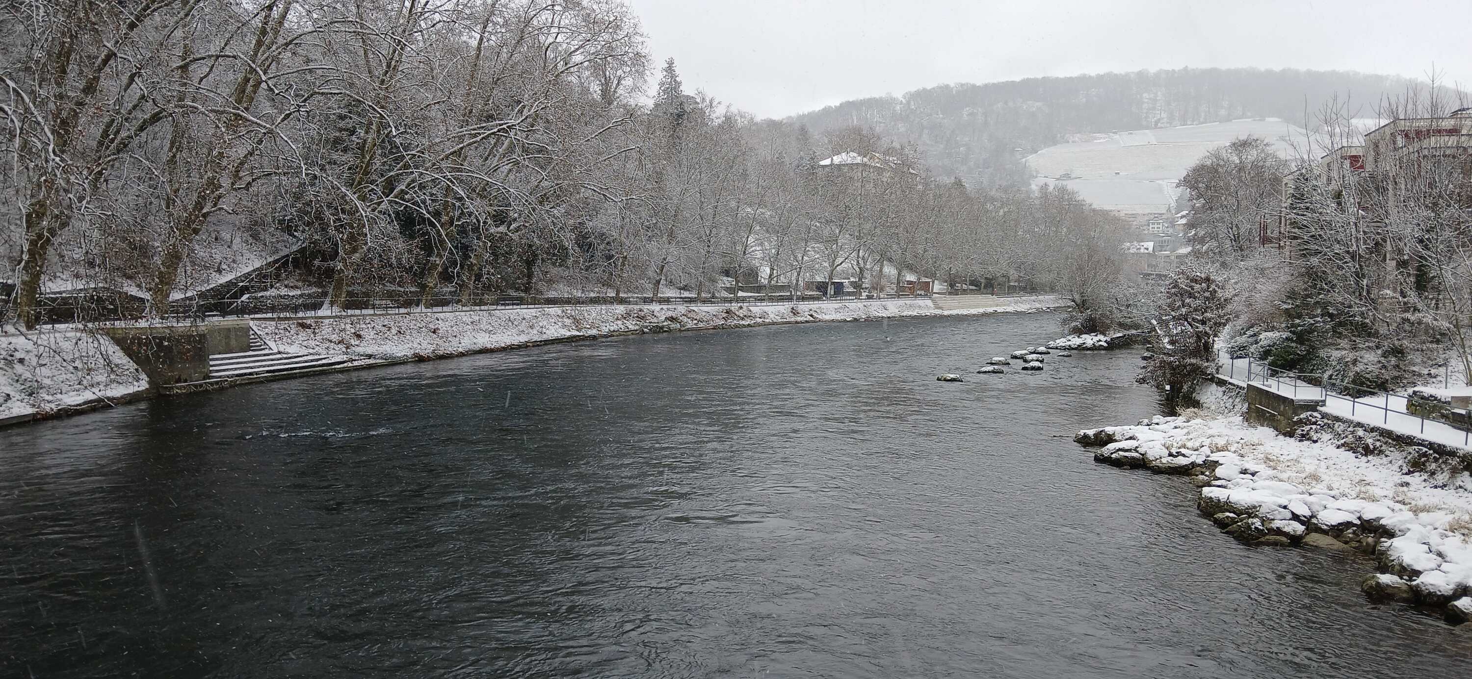 Hier in der Region Baden ist es doch ein bemerkenswerter Tag. Seit meinem Erwachen kurz nach 7 Uhr war es fast ununterbrochen am Schneien bis vor kurzem (aktueller Blick aus der Ferne aus dem Fenster: es scheint tatsächlich aufgehört zu haben). Am Morgen war es bei schwachem Niederschlag noch bisschen Schneeregen. Es war auch schon ersichtlich, dass heute ein Tag wird, bei dem mit jedem Höhenmeter weiter rauf das Winterfeeling zunimmt. Blick am Morgen über die Limmat in Richtung Ennetbaden: