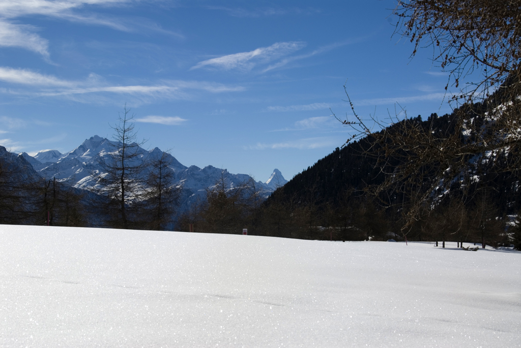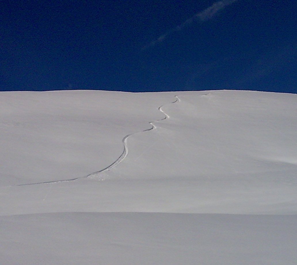 Aehnlich mild, aber trockener und entsprechend angenehmer (ausser dort wo der mässige WNW-Wind störte) war es 2000 m weiter oben. Herrlicher Pulverschnee, an exponierten Südhängen bereits Frühlingsschnee: