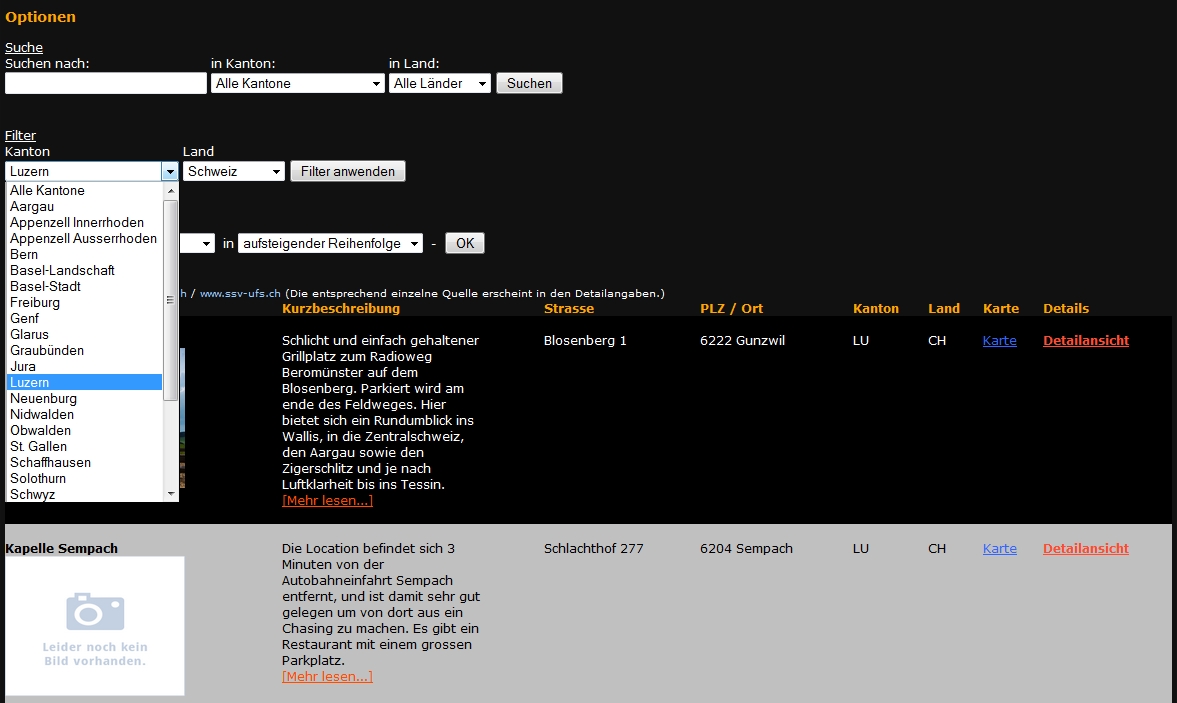 Bei der Übersicht sind alle Plätze, sortiert nach Namen aufgelistet. Es kann nach Kanton und Land gefiltert, nach Name, Ort, PLZ, Kanton und Land sortiert sowie nach beliebigen Wörtern gesucht werden. Gibt man im Suchfeld beispielsweise 'see' oder '%see' ein, so erscheinen alle Plätze wo es einen See gibt. Beispielsweise der Murten- oder Neuenburgersee. Hier einige Impressionen: