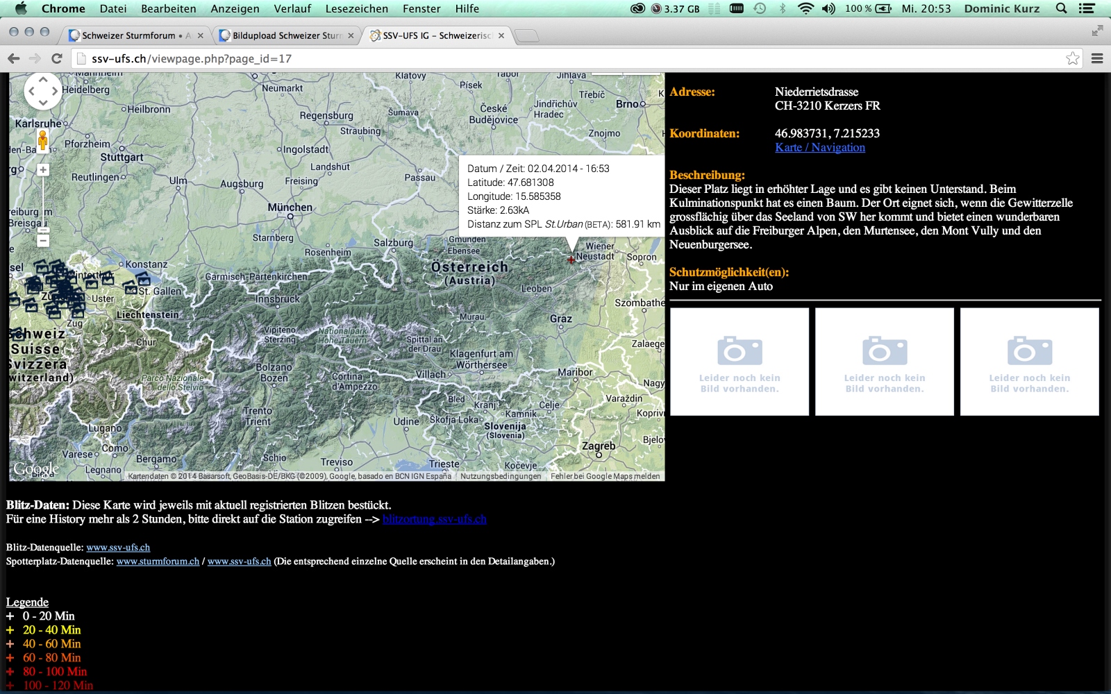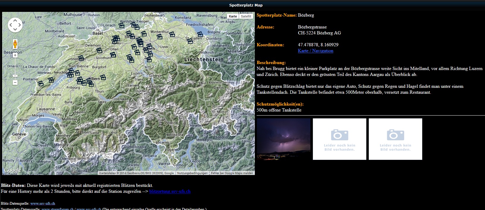 b) Die Spotterkarte ist - aufgrund Blitzdaten über das BO-Netzwerk welche nur für registrierte Teilnehmer gedacht ist - nicht öffentlich und somit nur intern nach einer Registrierung und dem Login auf http://www.ssv-ufs.ch erreichbar. Es kann sich jeder kostenlos und unverbindlich unter http://www.ssv-ufs.ch/register.php registrieren und wird anschliessend freigeschaltet für die Spotterkarte.