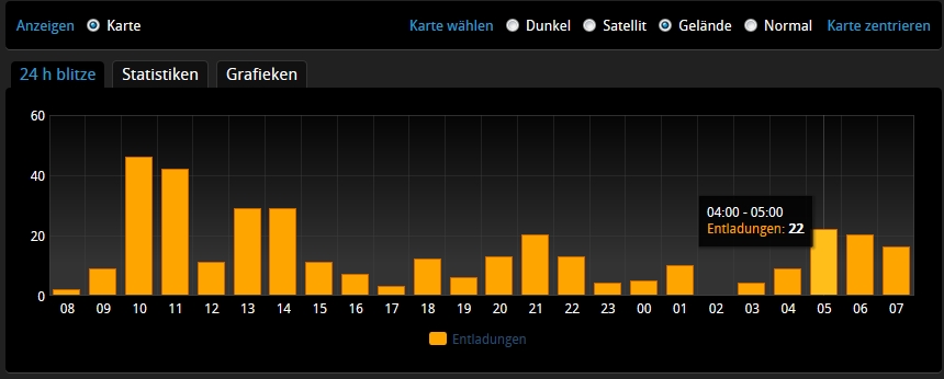 Ebenso angezeigt werden Entfernung, Richtung, Alter und eine 24 Stunden Blitzstatistik. Die Karte kann zwischen Dunkel, Gelände, Sattellit oder Normal gewechselt werden.