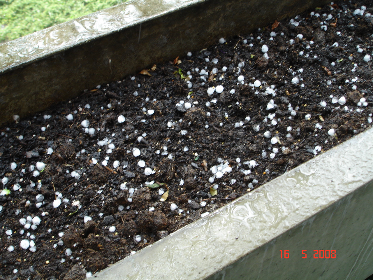 Hagel in der Blumenkiste, glücklicherweise noch nicht bepflanzt: