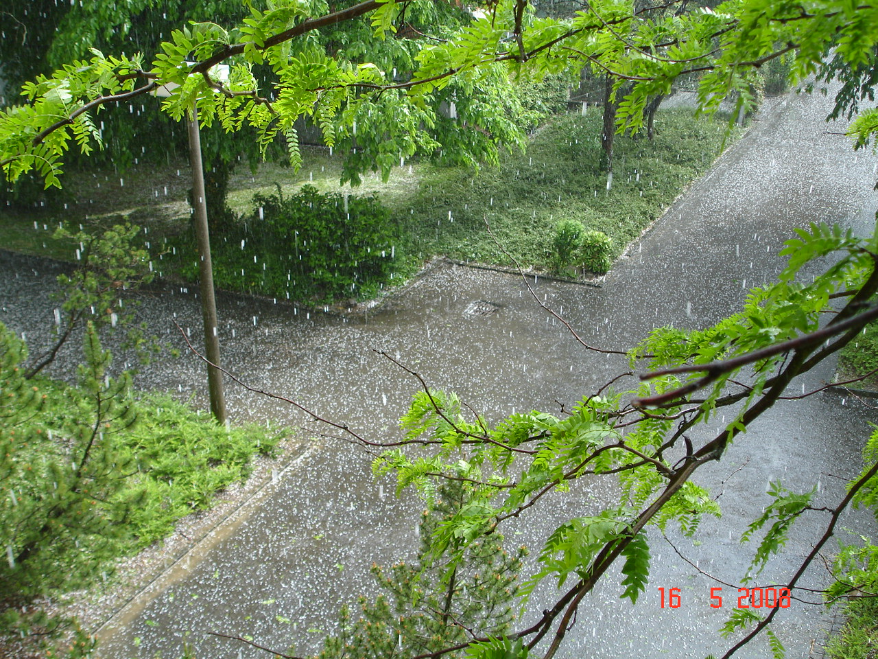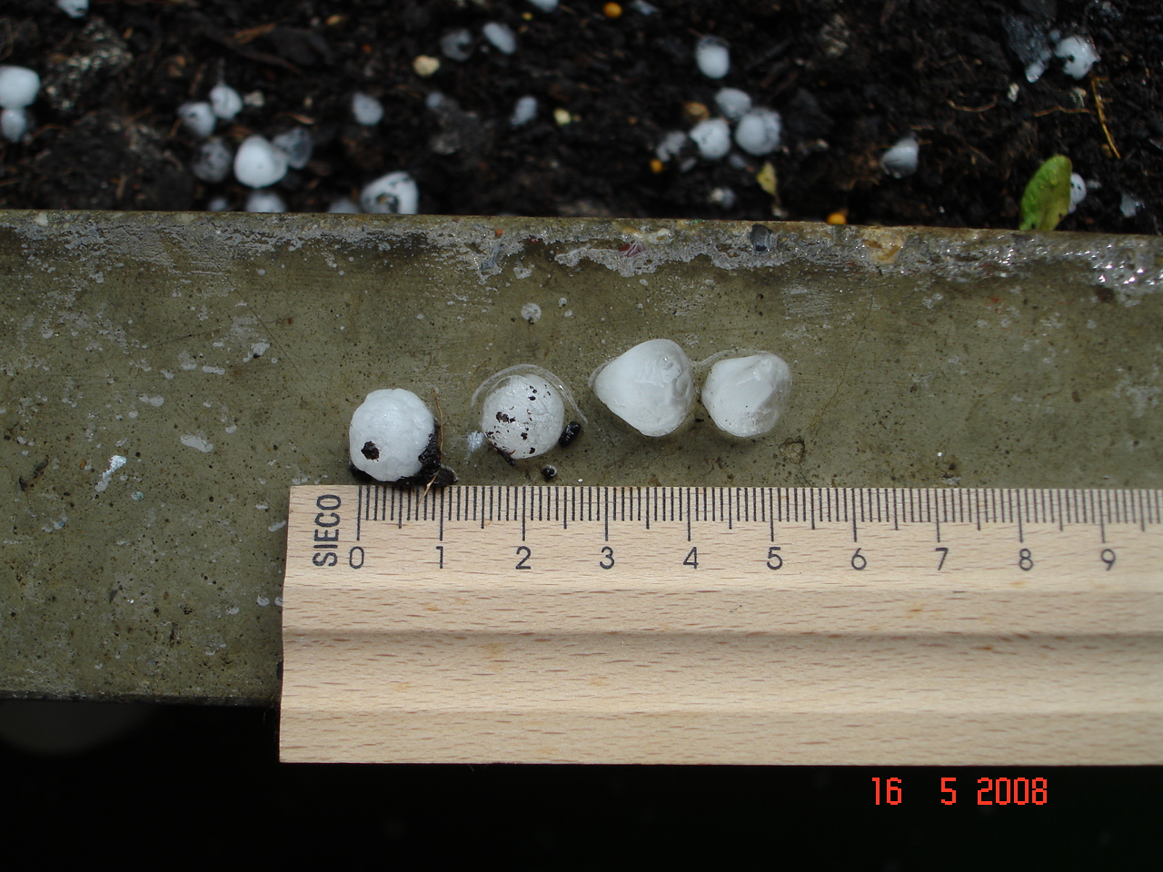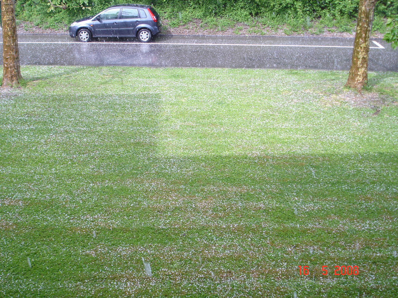 Um 16:05 setzte dann Starkregen ein und um 16:07 Uhr traute ich meinen Augen kaum, Hagel mit einem Durchmesser von wenigen Millimeter. Aus Millimetern wurde innert einer Minute etwa ein Zentimeter und ab 16:08 Uhr hagelte es mit Starkregen etwa 5 Minuten lang ununterbrochen stark. Um 16:13 beruhigte sich dann die Lage langsam, es fielen nur noch vereinzelt Hagelkörner und regnete leicht, aber die Kanalisation war wieder einmal überlastet und vermochte die Wassermassen kaum mehr zu schlucken. Die Schäden in den Schrebergärten, die bei uns gleich in der Nähe liegen, kenne dort eine bekannte Person, werden wohl gross sein. Vor allem Tomaten, Bohnen wurden arg in Mitleidenschaft gezogen. Die meisten Personen aus den Schrebergärten, begannen in den letzten Tagen die Hagel- und Windschutzvorrichtungen aufzubauen, aber waren noch nicht fertig damit. Auch Blumen auf den Balkonen hat es arg in Mitleidenschaft gezogen. Die Hagelkörner hatte etwa ein maximalgrösse von 1 Zentimetern.