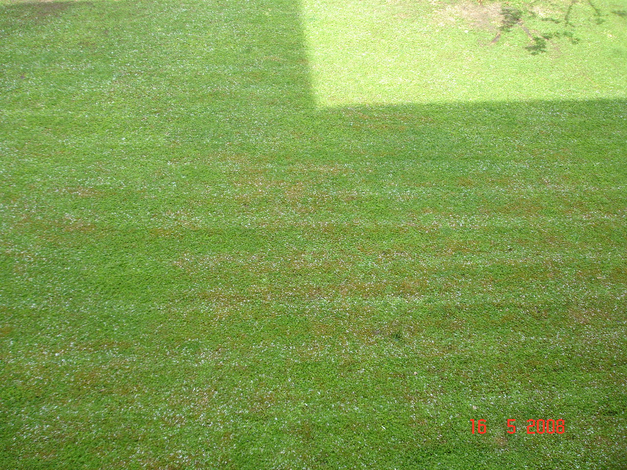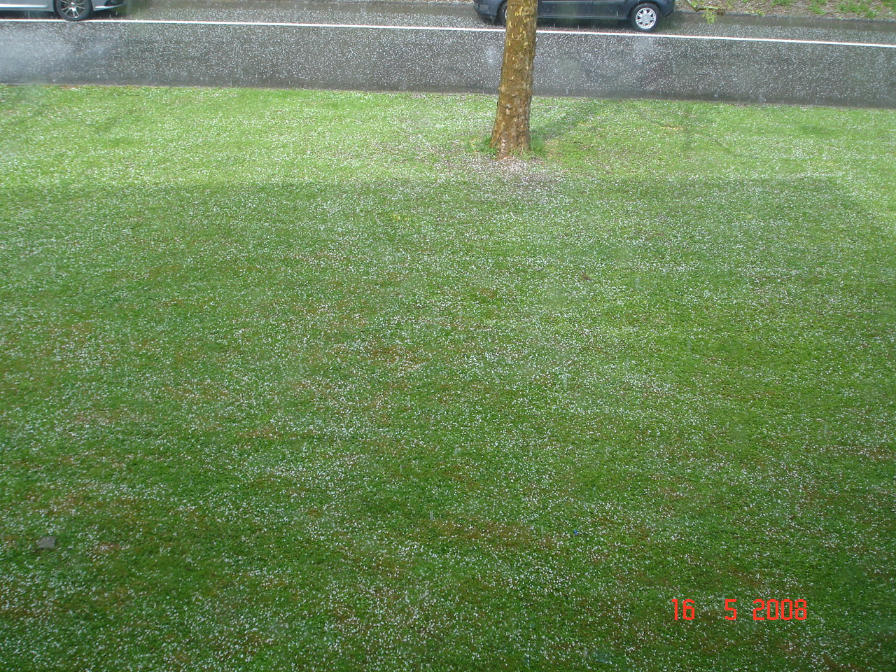 Etwa 2 Minuten nach dem Beginn des Hagels, man sieht den Hgael auf dem Rasen liegen: