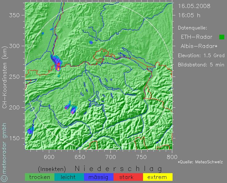 Hier noch der Printscreen des Radarloops um 16:05Uhr, als sich hier über Muttenz das Gewitter sich began zu entladen: