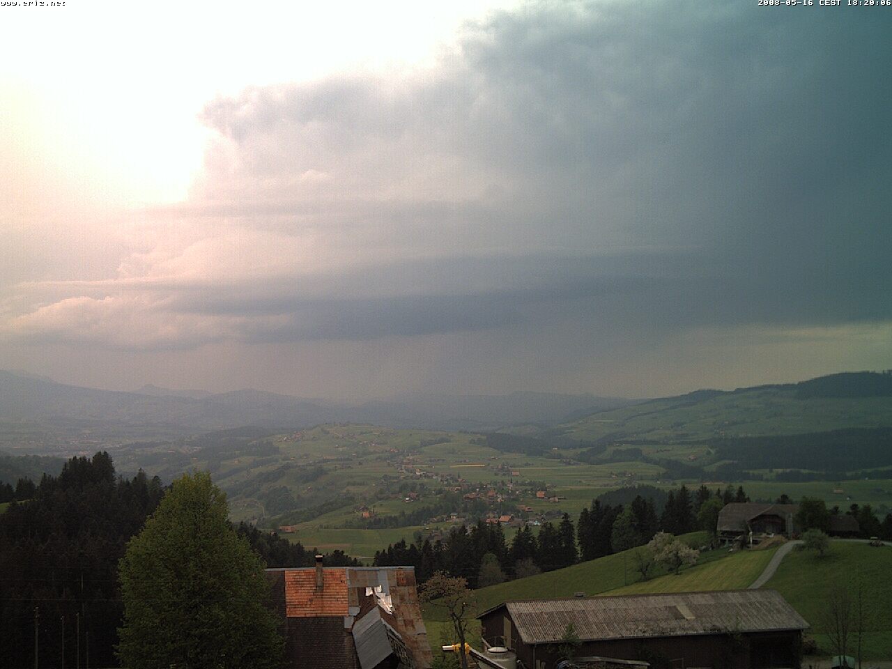 Kann ich bestätigen. Die Zelle steht westlich des Pilatus, Schirm nach Nordosten ausgeweht mit Mammatusstrukturen, abschwächend. Immerhin ist regelmässig Donner zu hören. Richtung Rigi und Zug steigen zwei schöne TCu in den Himmel. Vielleicht wird daraus noch was.