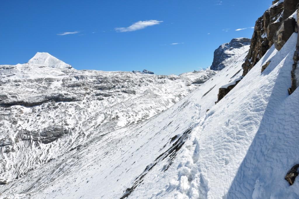 Ab letzterer war Spuren angesagt, da lagen durchwegs 20 cm. Nicht der erwartete Pappschnee, sondern ich könnte fast von gut komprimiertem Pulver sprechen! Entsprechend verweht versank man hie und da schon ganz anständig.