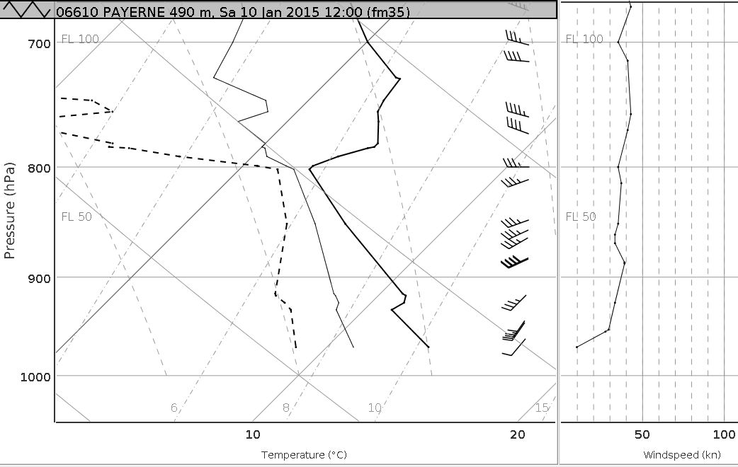 Hier noch ein Ausschnitt aus der Radiosondierung von Payerne. Gut sichtbar die Inversion. Leider war es etwas zu trocken, so dass der fehlende Stratocumulusdeckel verbunden mit der milden Luftmasse Sommerkinder frohlocken lässt.