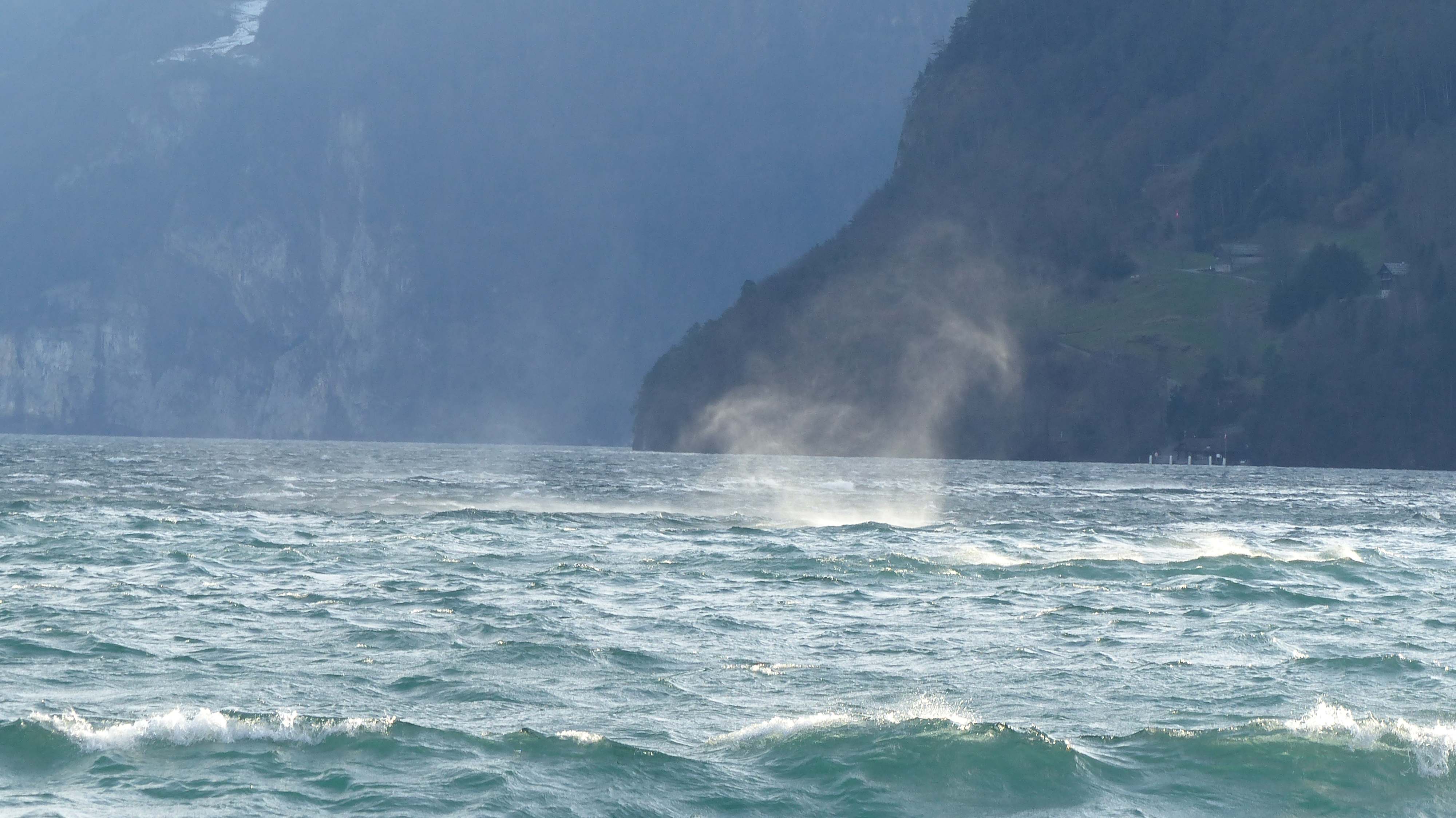 Wie oben erwähnt, ist der Föhnsturm heute nicht so extrem wie andere in der Vergangenheit. Trotzdem reichte es für ein paar nette Fotos. Ich war heute Nachmittag, ca. 15:30 bis 16:30 in Brunnen. Obwohl der Föhnsturm noch nicht so stark war, konnte ich trotzdem ein paar Wasserteufel fotografieren. Sie waren recht kurzlebig und darum schwierig zum filmen.