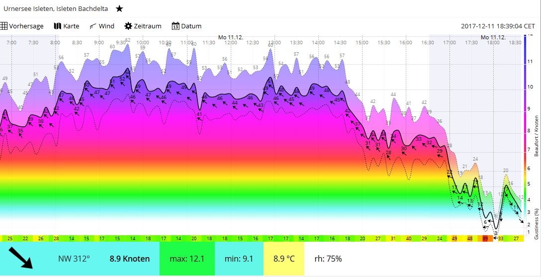 Kurz danach folgte das Mittagsmaximum von 60 Knoten. Diese Böe habe ich leider verpasst, weil ich etwas am Fotoapparat herumhantiert habe.