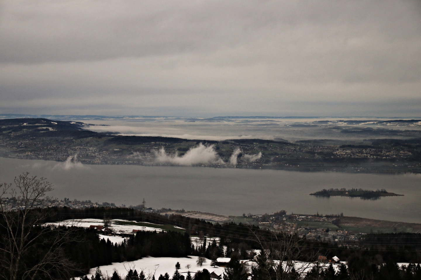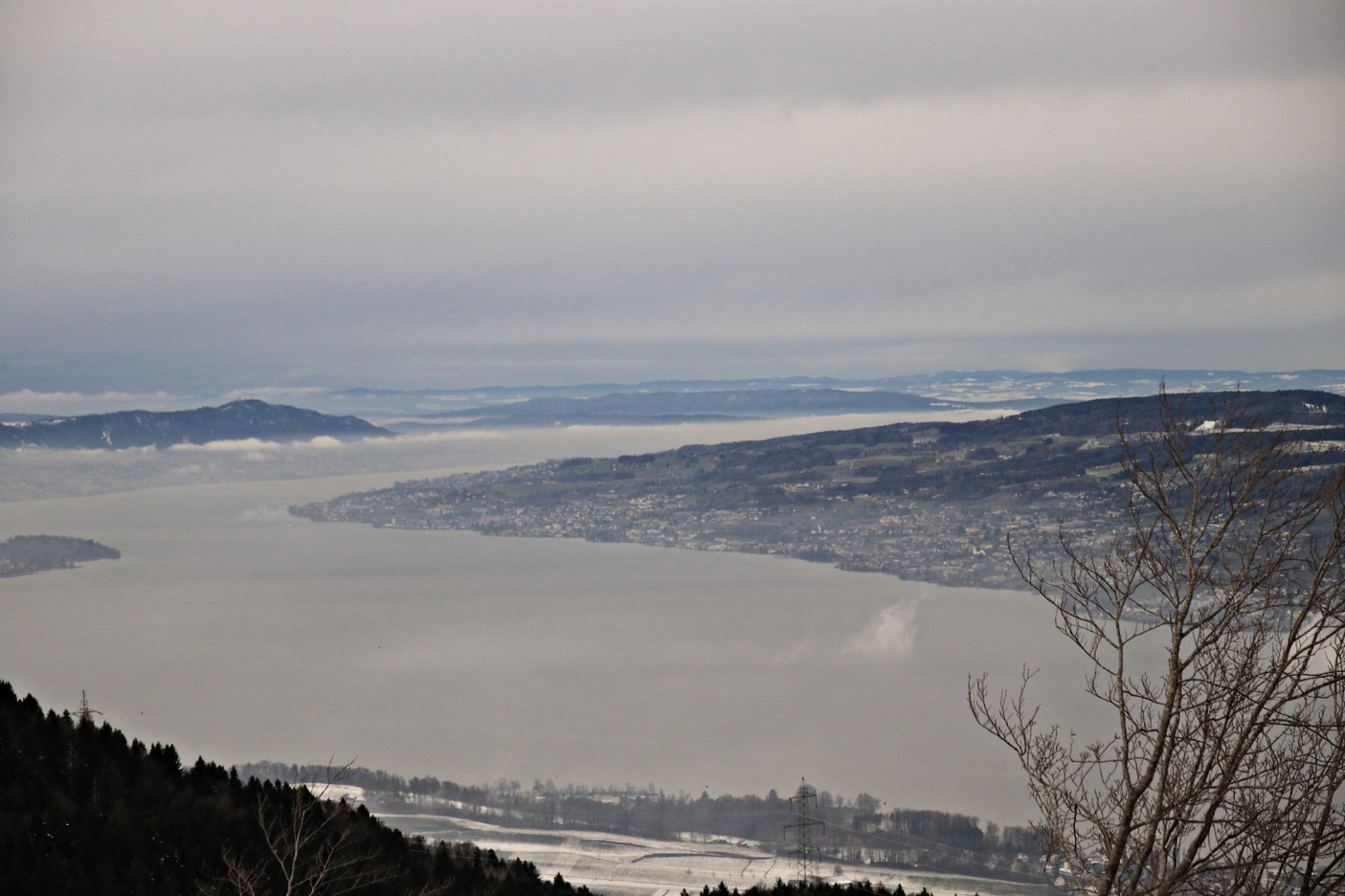 Blick auf den Zürichsee, die Pfannenstielkette und das Glatttal unter dem Hochnebel