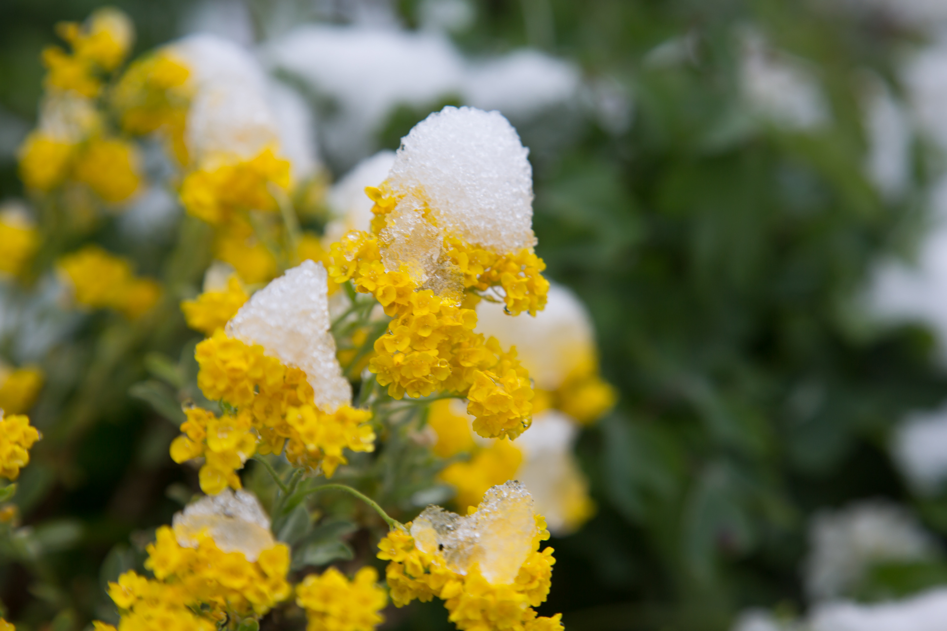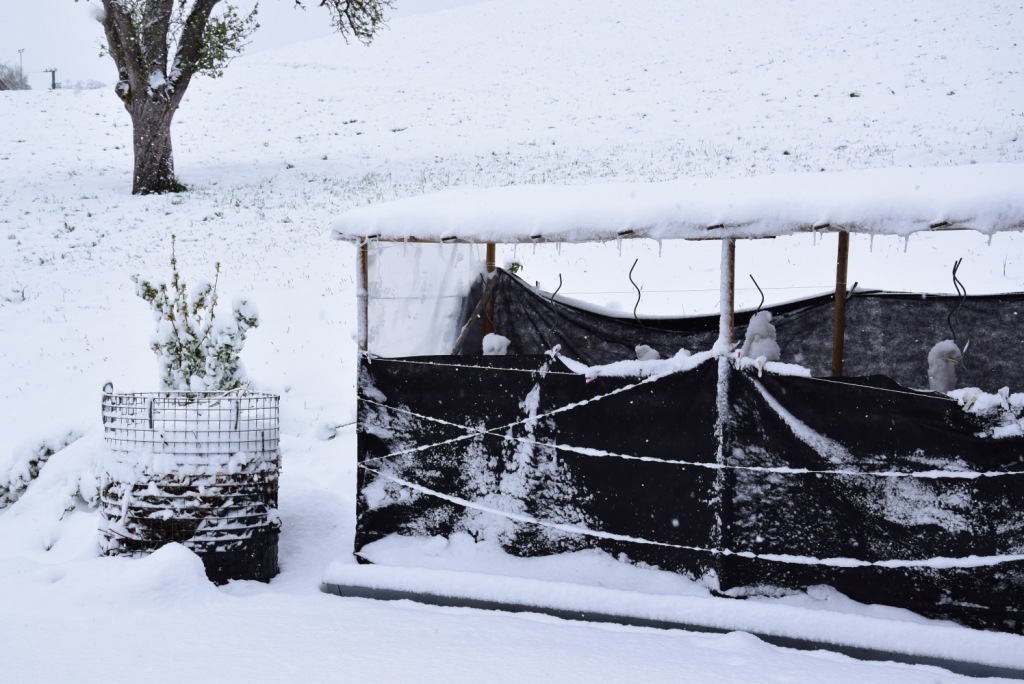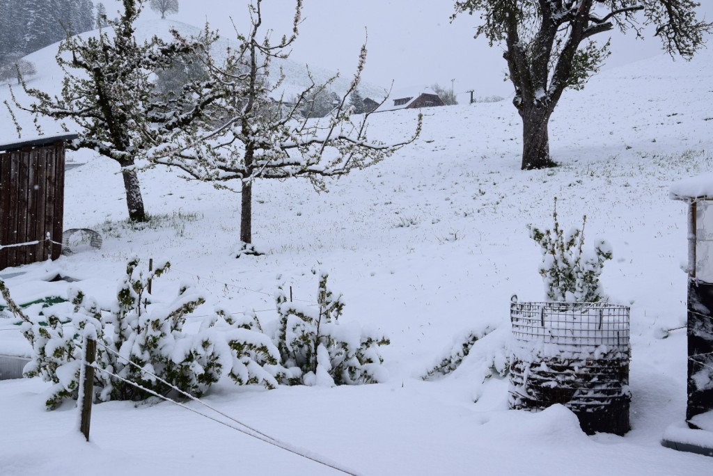 Derzeit hängen Eiszapfen über den Tomaten, die Obstblüten sind von einer netten Schneeschicht umgeben. Dies ist förderlich, um Frostschäden vorzubeugen. Es bleibt zu hoffen, der Schnee bleibt bis morgen früh hängen, damit die empfindlichen Pflanzen auch gut geschützt sind.