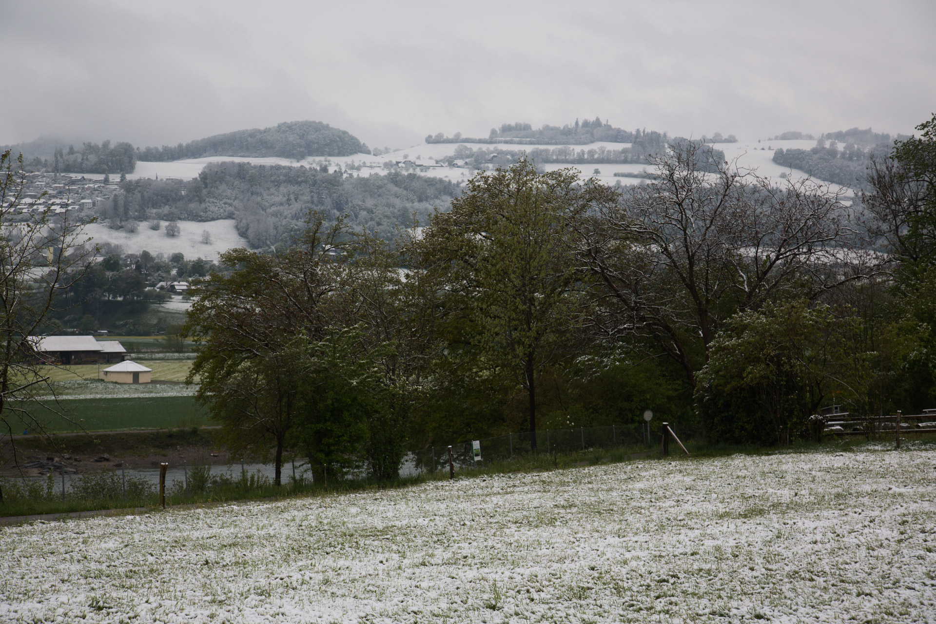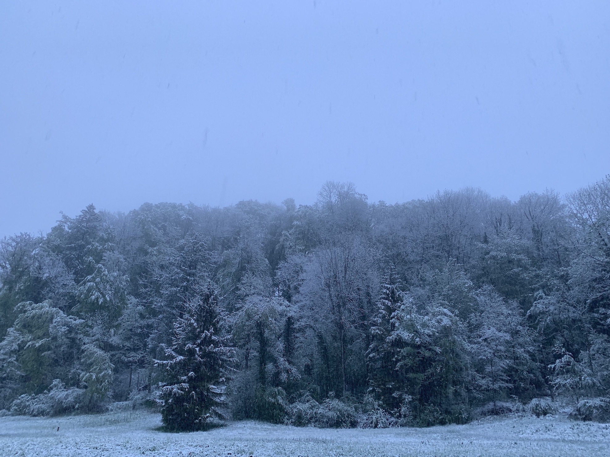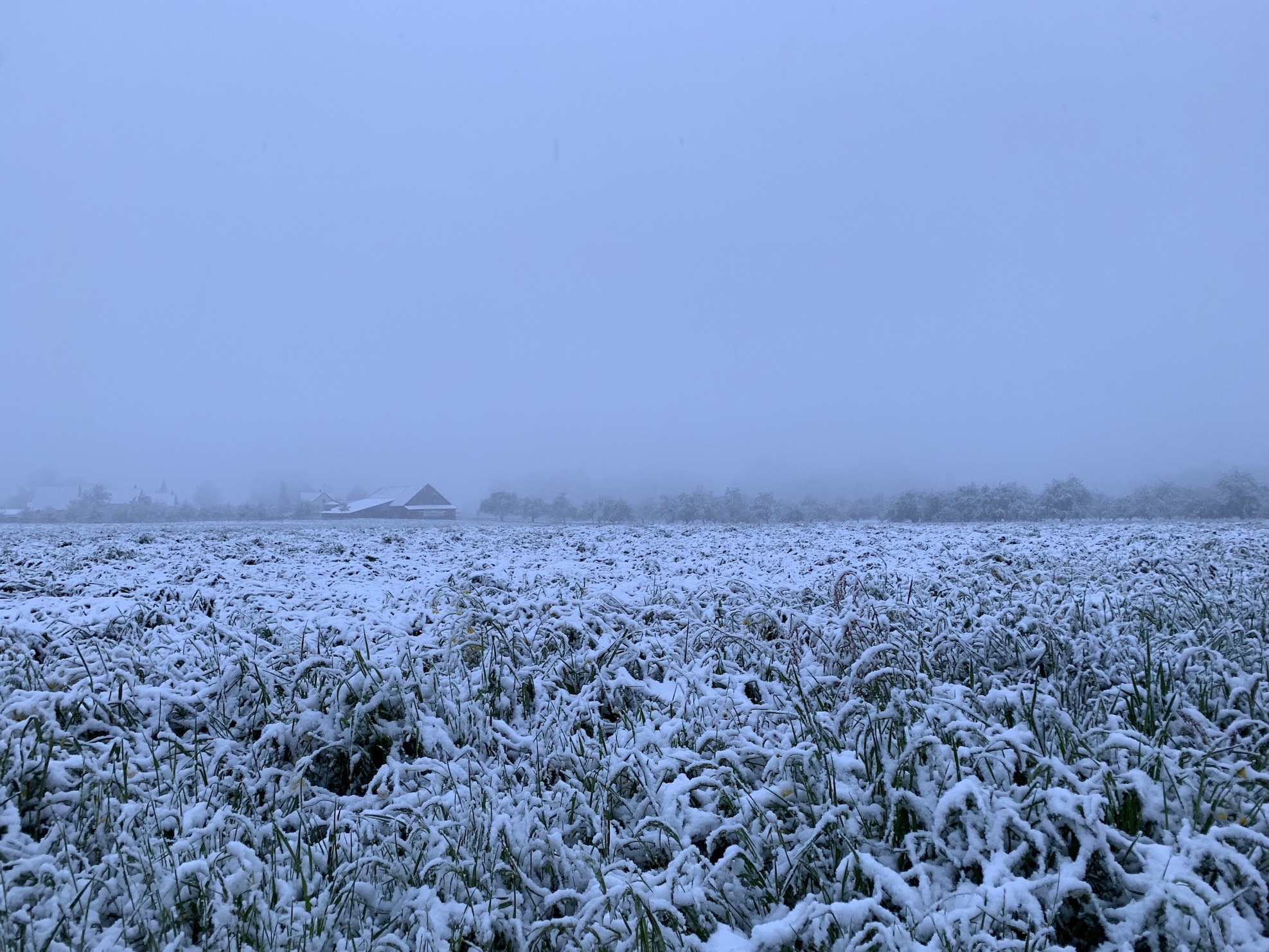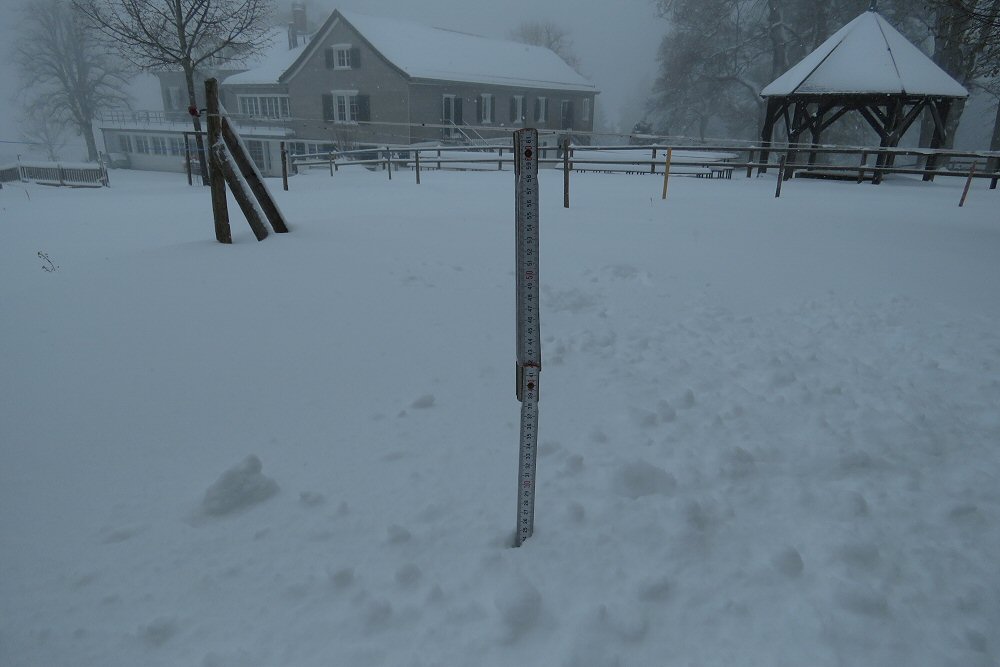 Effektiv begann die Abkühlung im Emmental auf 850 m ü.M. um 17:30 Uhr, um 19:00 Uhr wurden die 0 °C bereits unterschritten. Bis am Abend blieben trotzdem nur 3 cm hängen, in der Nacht kam jedoch eine ordentliche Ladung dazu: Heute Morgen lagen immerhin 12 cm Schnee!