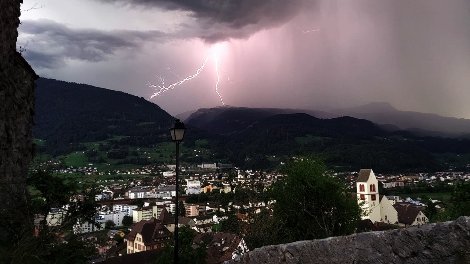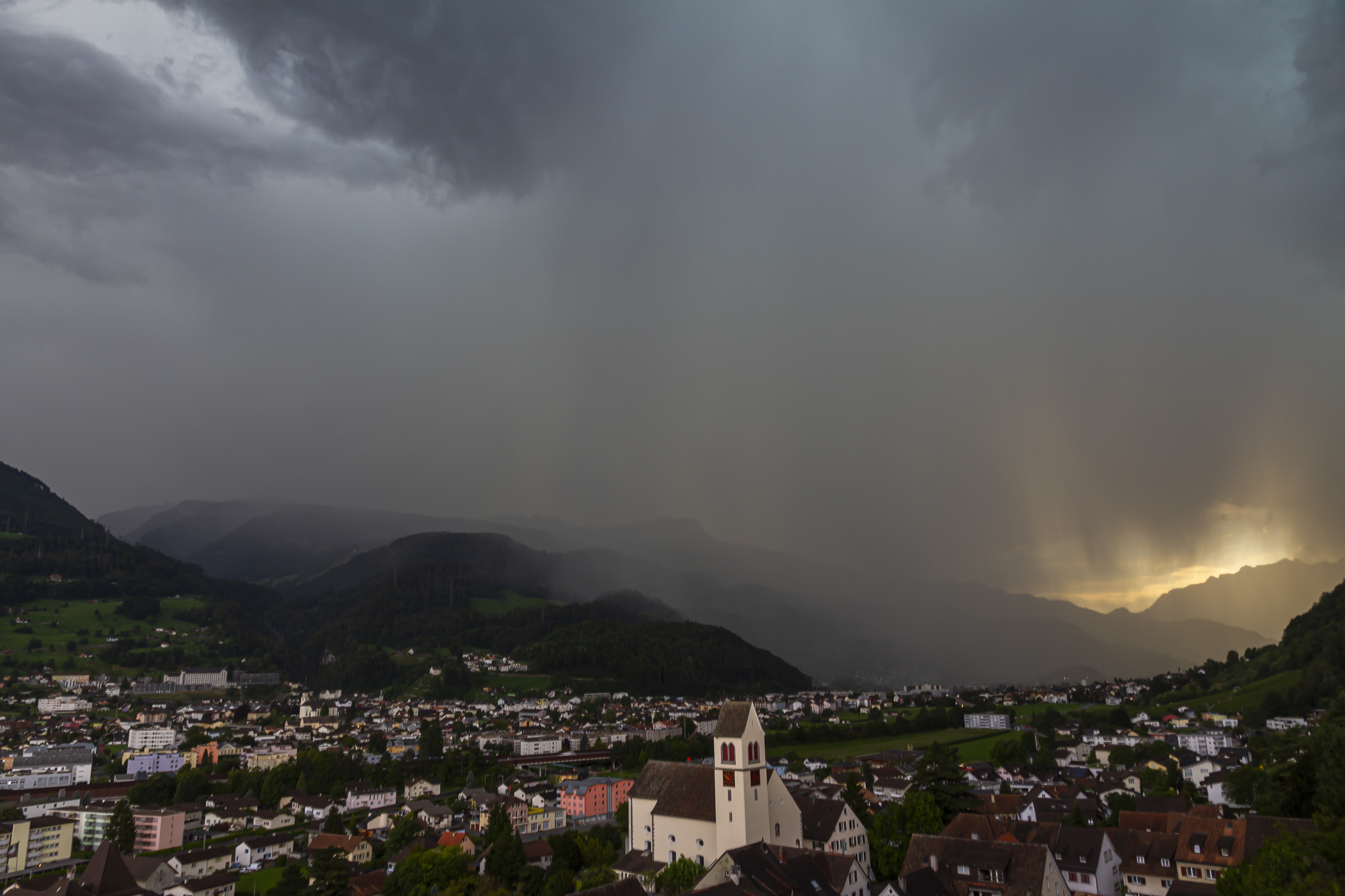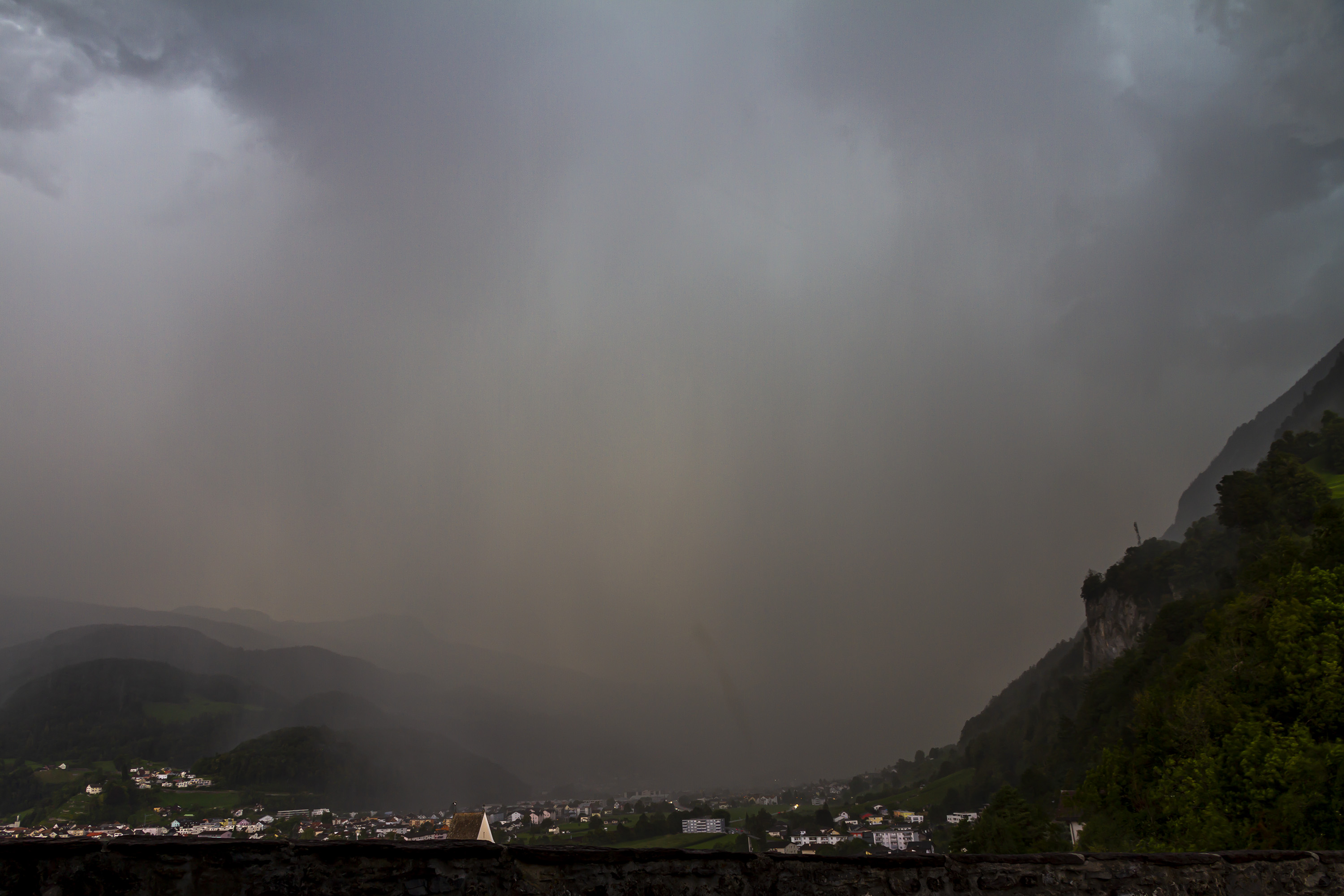 Es ergiesst sich Starkregen mit Sturm über den Schlosshügel, kanalisiert durch den Gonzen oberhalb. Es fallen geschätzte 10 bis 15 mm Regen, ohne Hagel: