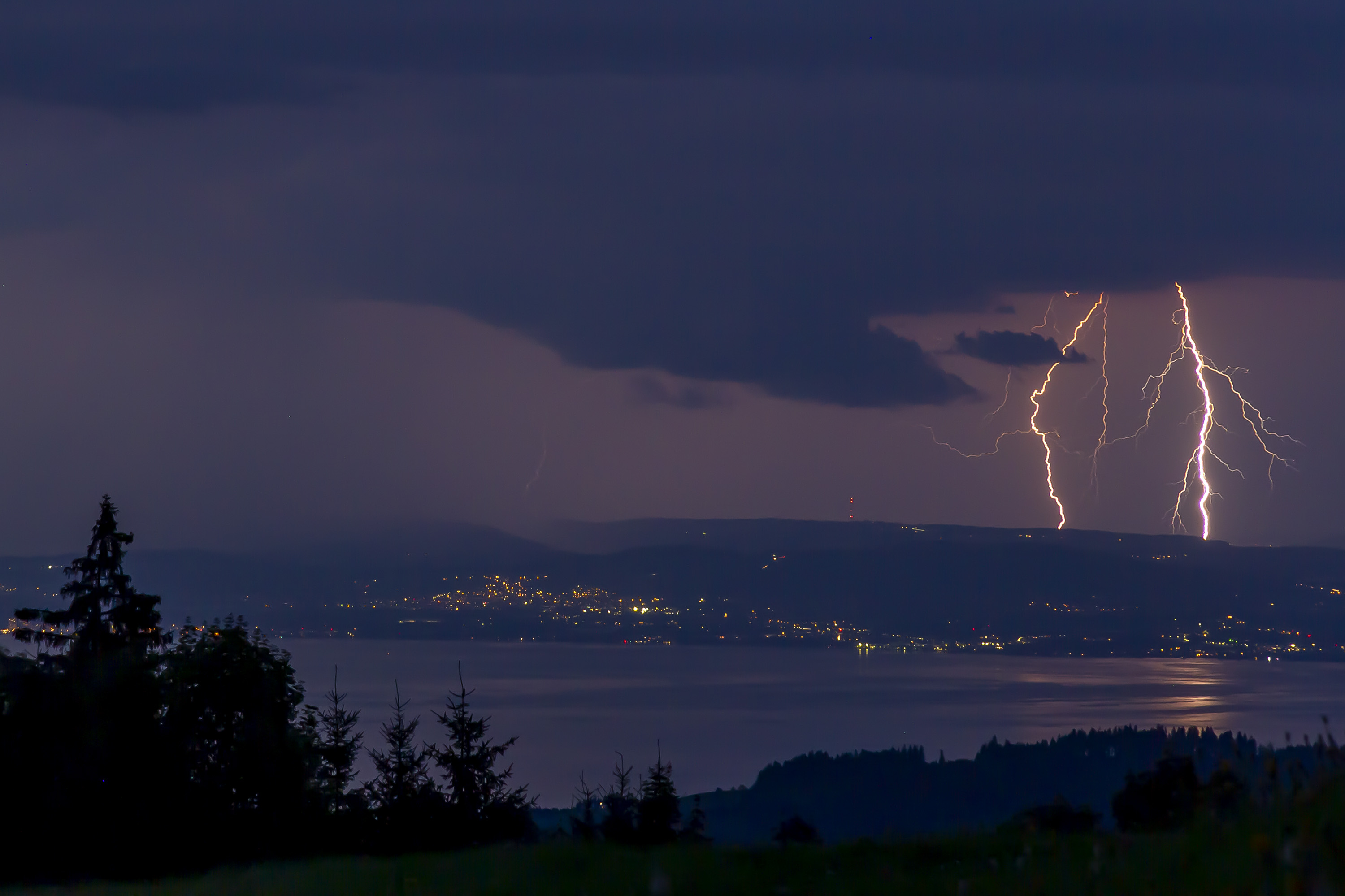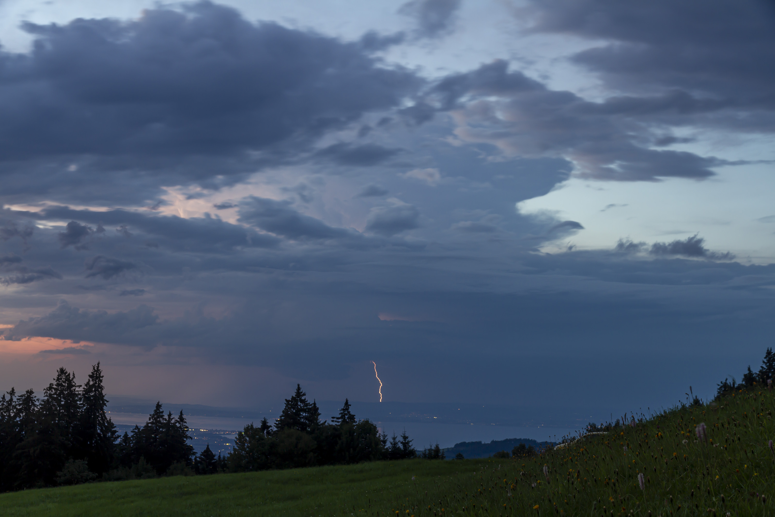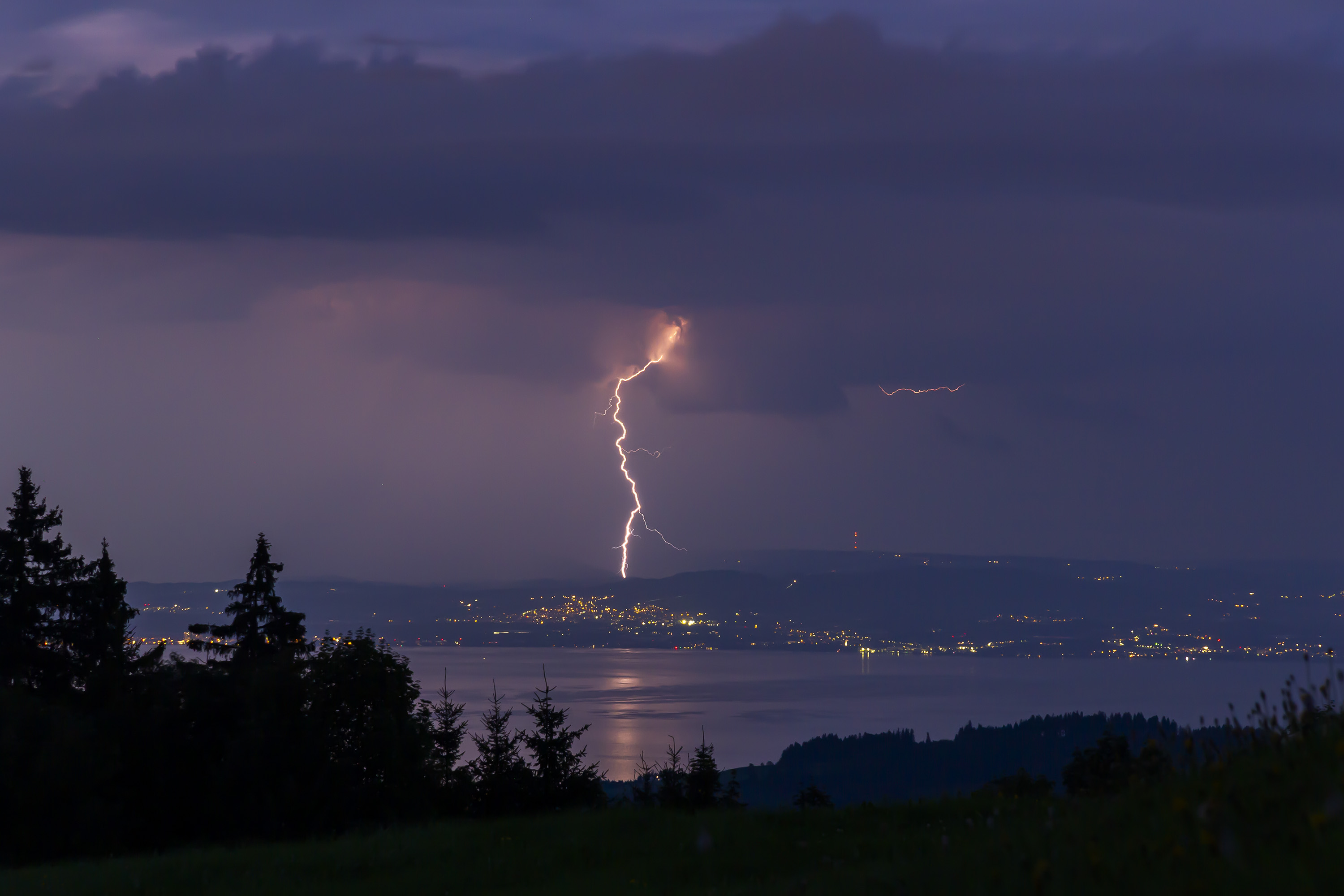 Es ist die sehr glückliche Konstellation, dass die Distanz von hier zum See etwa gleich ist, wie vom See zum Gewitter nördlich davon. Damit reflektiert sich das Licht der Blitze im Wasser, ohne dass man am See unten sein muss. Ich habe lange auf sowas gewartet!