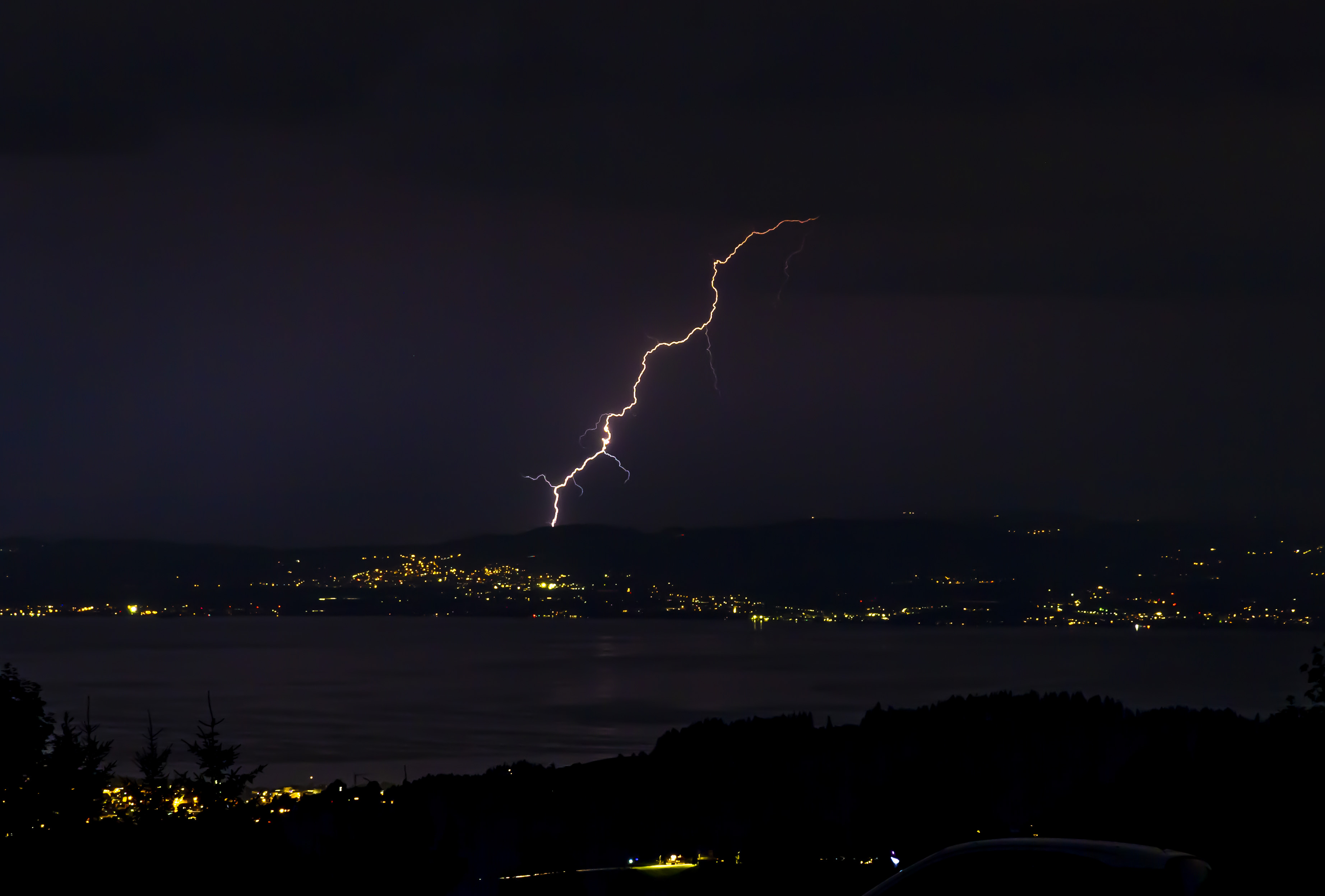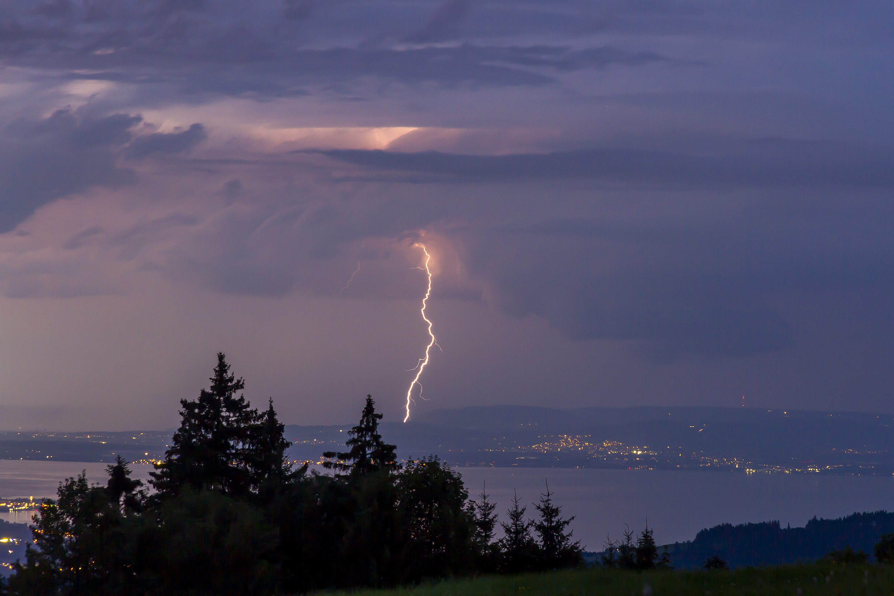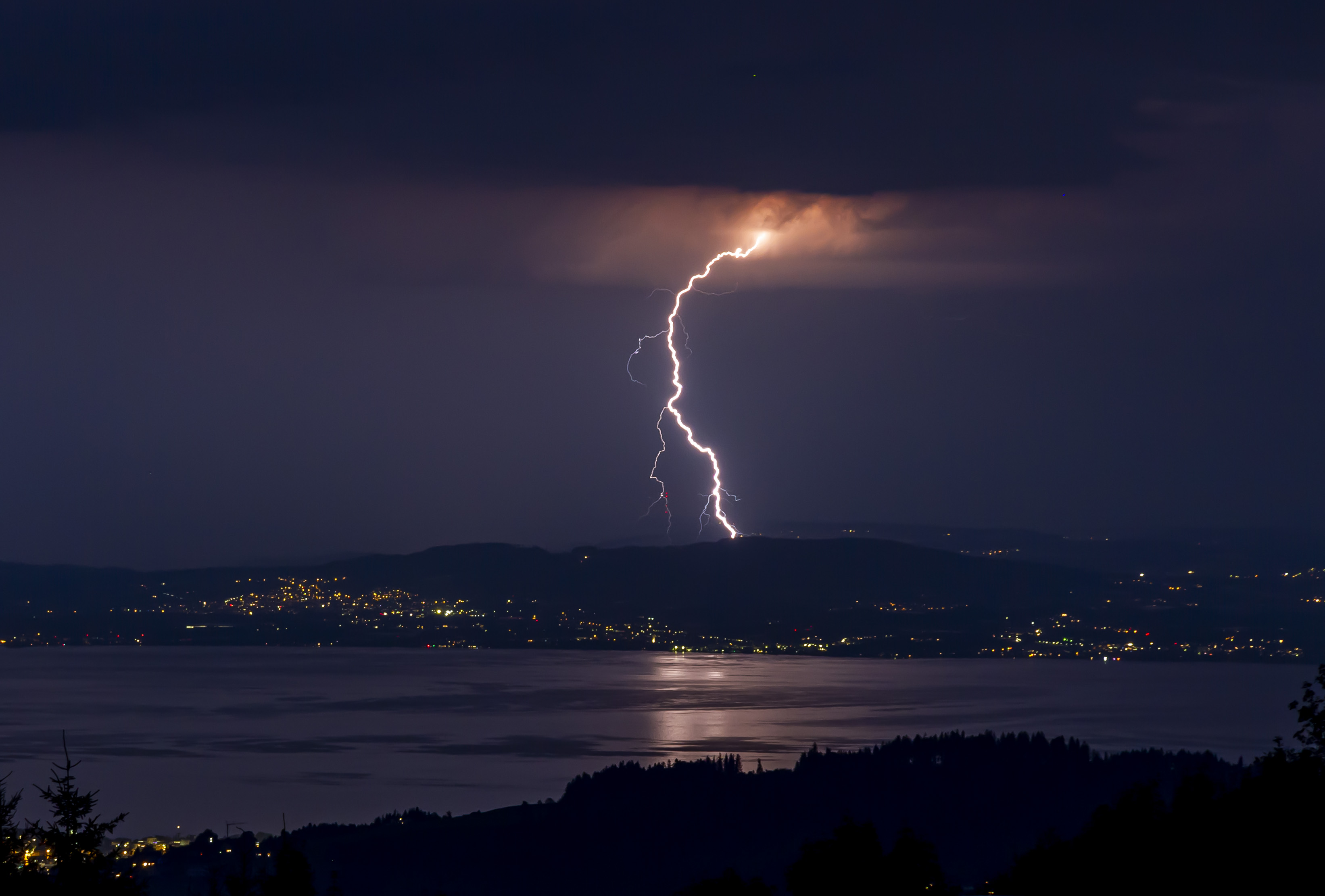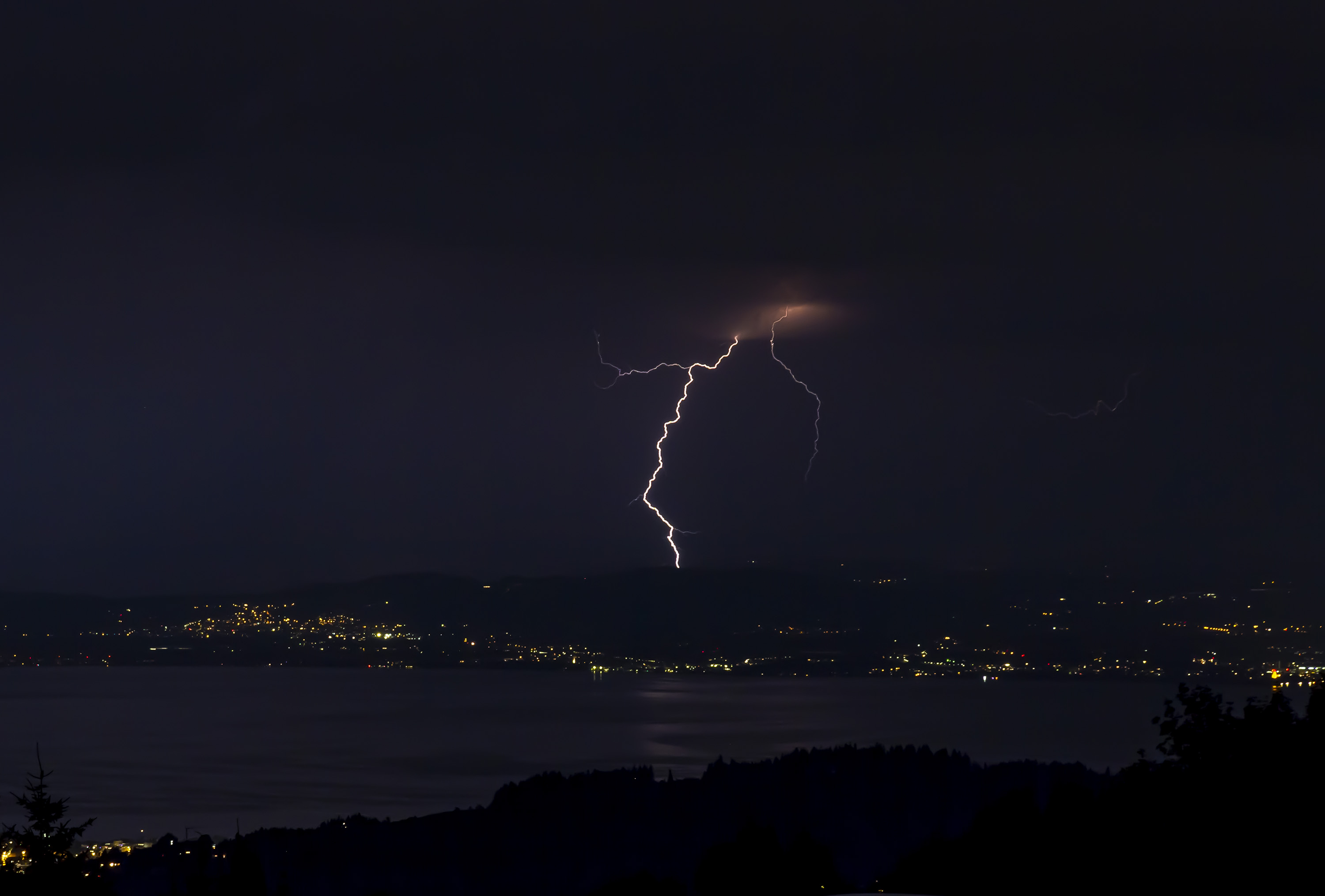 Es ist die sehr glückliche Konstellation, dass die Distanz von hier zum See etwa gleich ist, wie vom See zum Gewitter nördlich davon. Damit reflektiert sich das Licht der Blitze im Wasser, ohne dass man am See unten sein muss. Ich habe lange auf sowas gewartet!