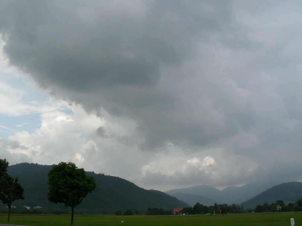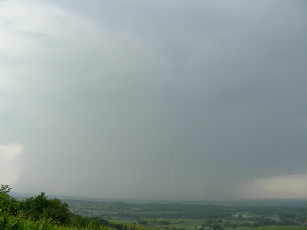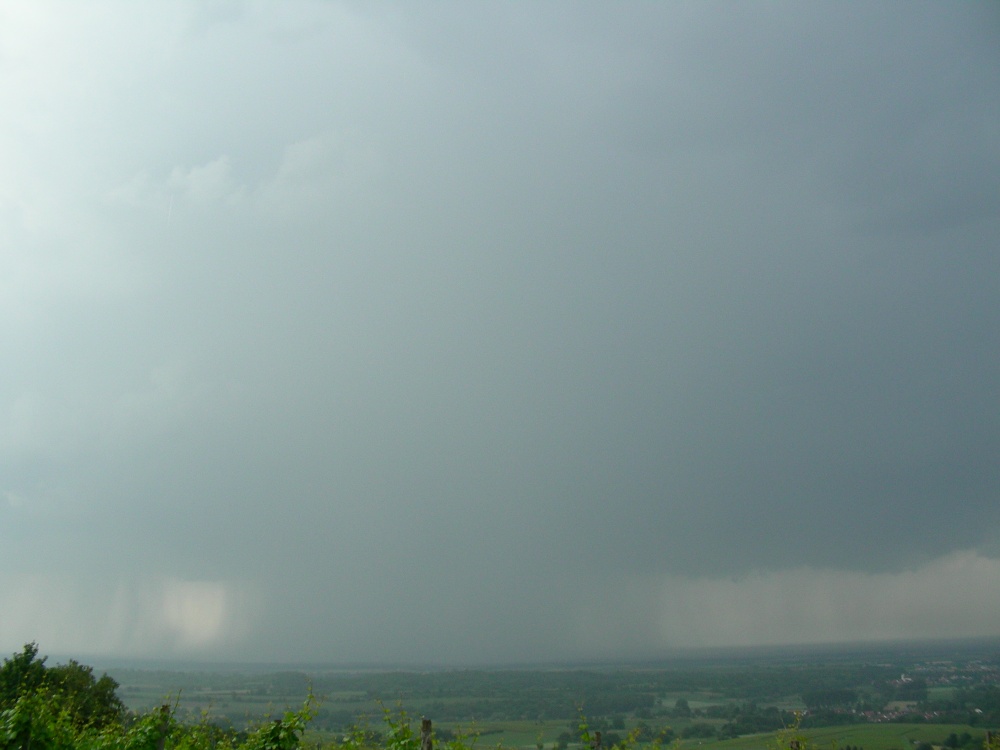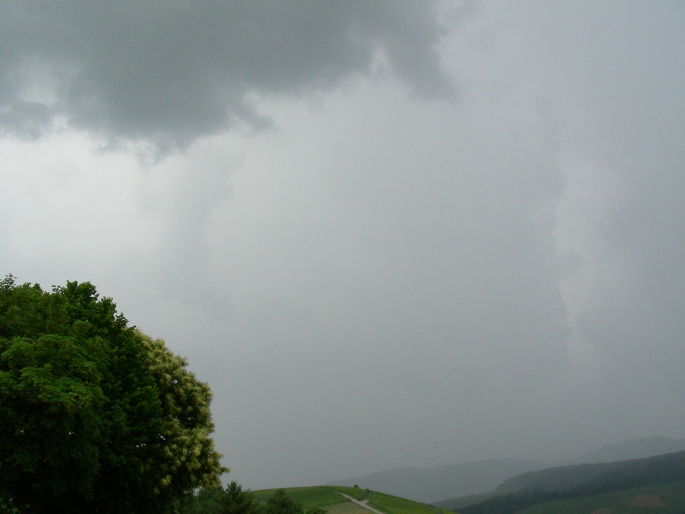 also...wie schon vorhin geschrieben machte ich pünktlich mit dem Eintreffen des Gewitters in Freiburg Feierabend und fuhr heimwärts, knapp südlich von Freiburg machte ich den ersten kleinen Zwischenstopp. Man kann den Aufwind der Zelle am rechten Bildrand erahnen, allerdings waren die Konturen aufgrund des kräftigen Niederschlags bzw. schwachen Kontrastes kaum zu erkennen. 15.15 Uhr: