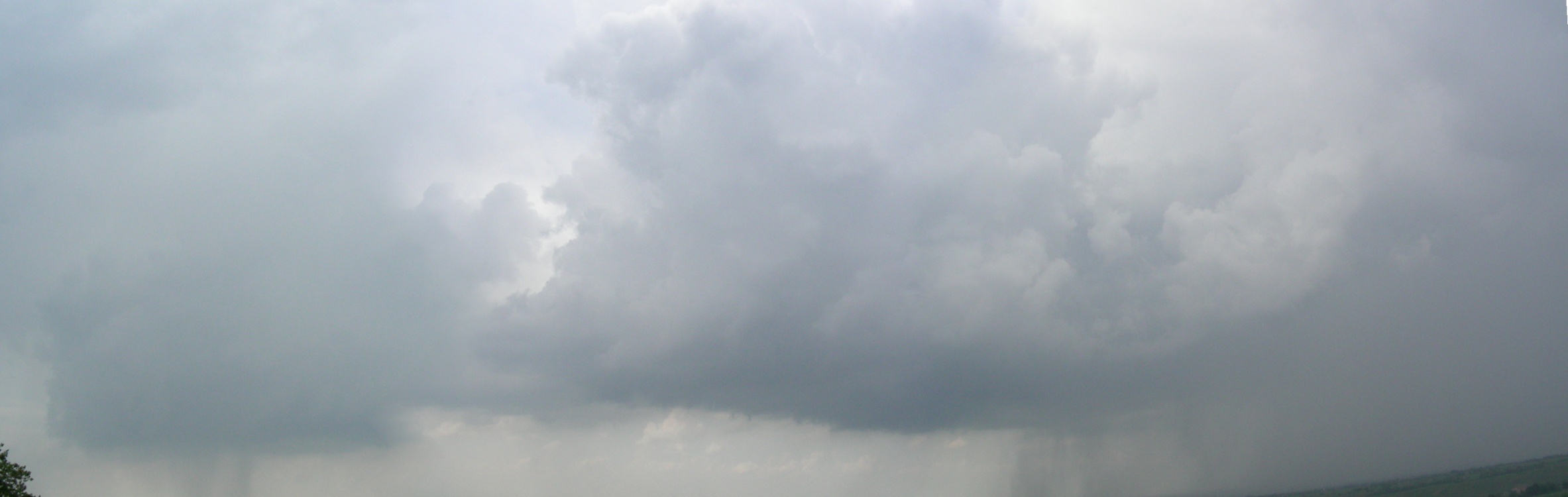 Auf meinem Hausberg angekommen, bot sich folgendes Bild. Ganz links bzw. ganz im SW löste sich eine "alte" Gewitterzelle langsam aber sicher auf, während sich ganz rechts der immernoch eindrucksvolle Rainfoot der Freiburger Zelle ankündigte. Zwischen den beiden Zellen gab es eine Neuentwicklung (auf dem Bild Cu con (?)), die mich für die nächste Stunde unterhalten sollte ;-). 15.45 Uhr: