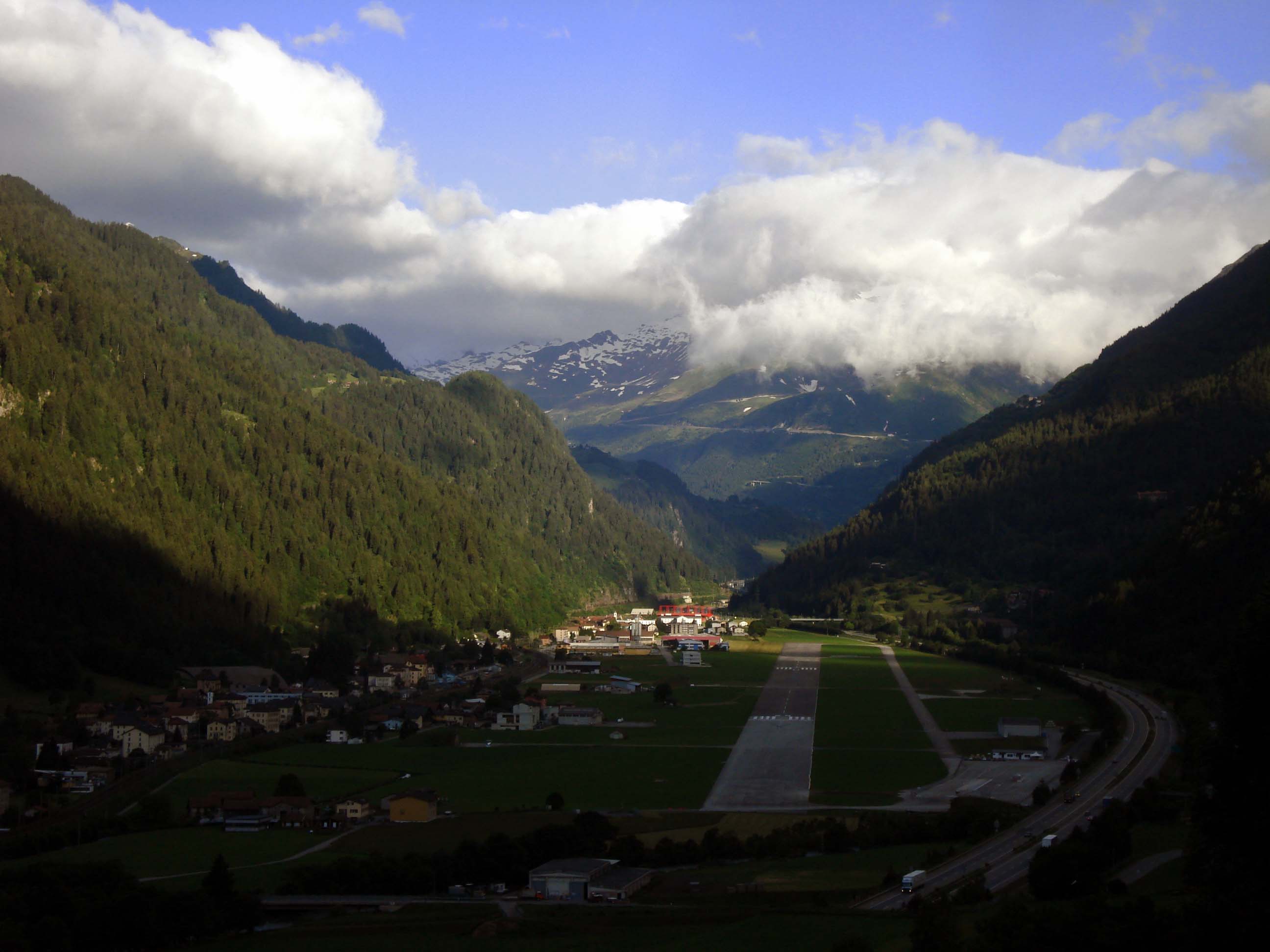 Als ich von meinem Italienchasing (19.-20.06.09) frühmorgens (20. Juni) in die Schweiz zurückkehrte, war die feuchtewarme, trübe Suppe vom Vorabend in den Tessiner Tälern weggefegt und das goldene Morgenlicht zauberte eine eigentümlich "gereinigte" Atmosphäre in die tolle Landschaft. Von Nordosten her krochen förmlich die Wolken über die schneebedeckten Berggipfel. Hier ein Foto vom Gotthard-Massiv (rechts unten die Gotthardautobahn) um 07:36 Uhr: