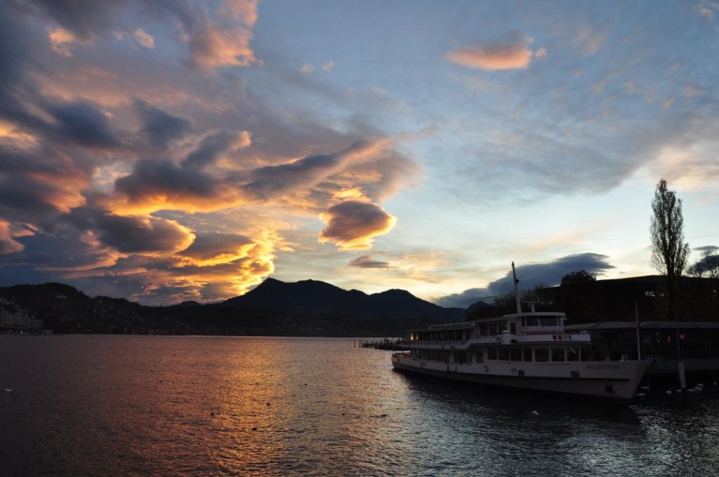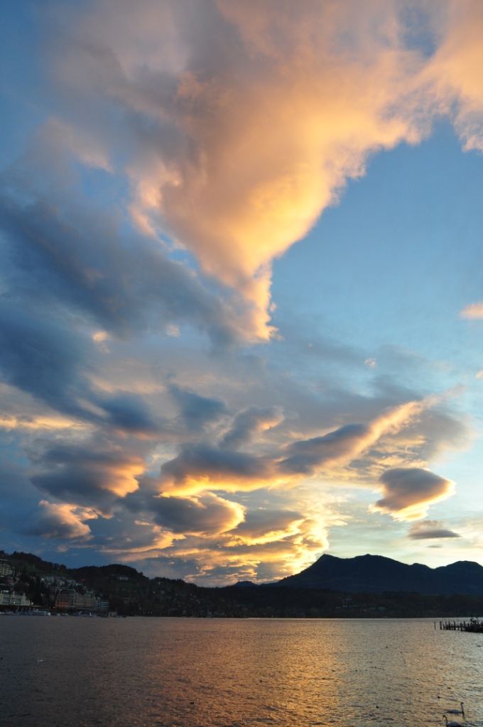 Durchbruch der Föhnluft. Bei Windrichtung SW und S stehen uns der Dietschi-/Dottenberg im Weg. So wird die Luftzirkulation spätestens bei Meggen (unten am See) und Adligenswil (am Südabhang des Dottenbergs) rechts und links "umgeleitet". Richtigen Föhn erhalten wir bei Anströmung SE durch das Götzental, zwischen Dotten- und Rooterberg hindurch (Düsenwirkung).