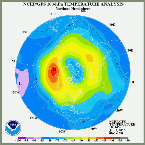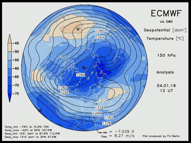 b)canadian warmings treten als Folge einer Verstärkung und Verlagerung des troposphärischen Alëutenhochs nach Norden ein. Es wird eine Umkehr des Temperaturgradienten und eine kurzzeitige Umstellung der Zirkulation beobachtet. + Stratosphärenerwärmung