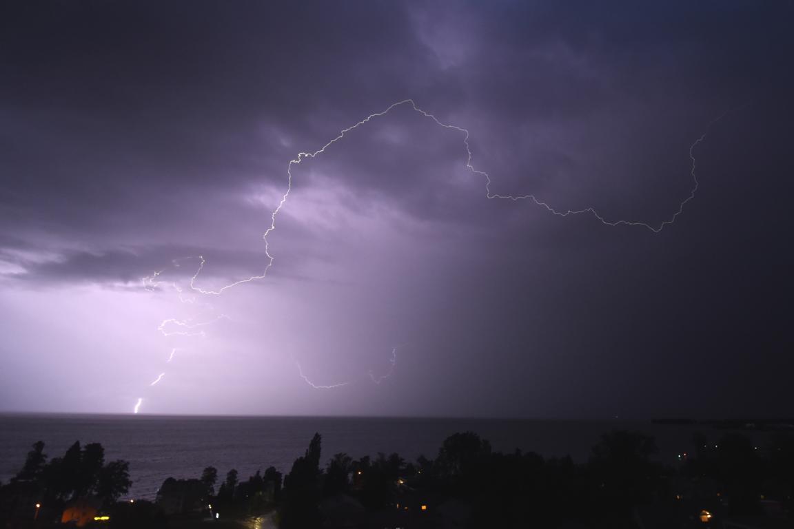 Hier ist ein kräftigeres Gewitter aus dem Südwesten aufgezogen; es hat leicht gehagelt mit kleinen Körnern, das Gewitter hat eine beträchtliche Blitzaktivität.
