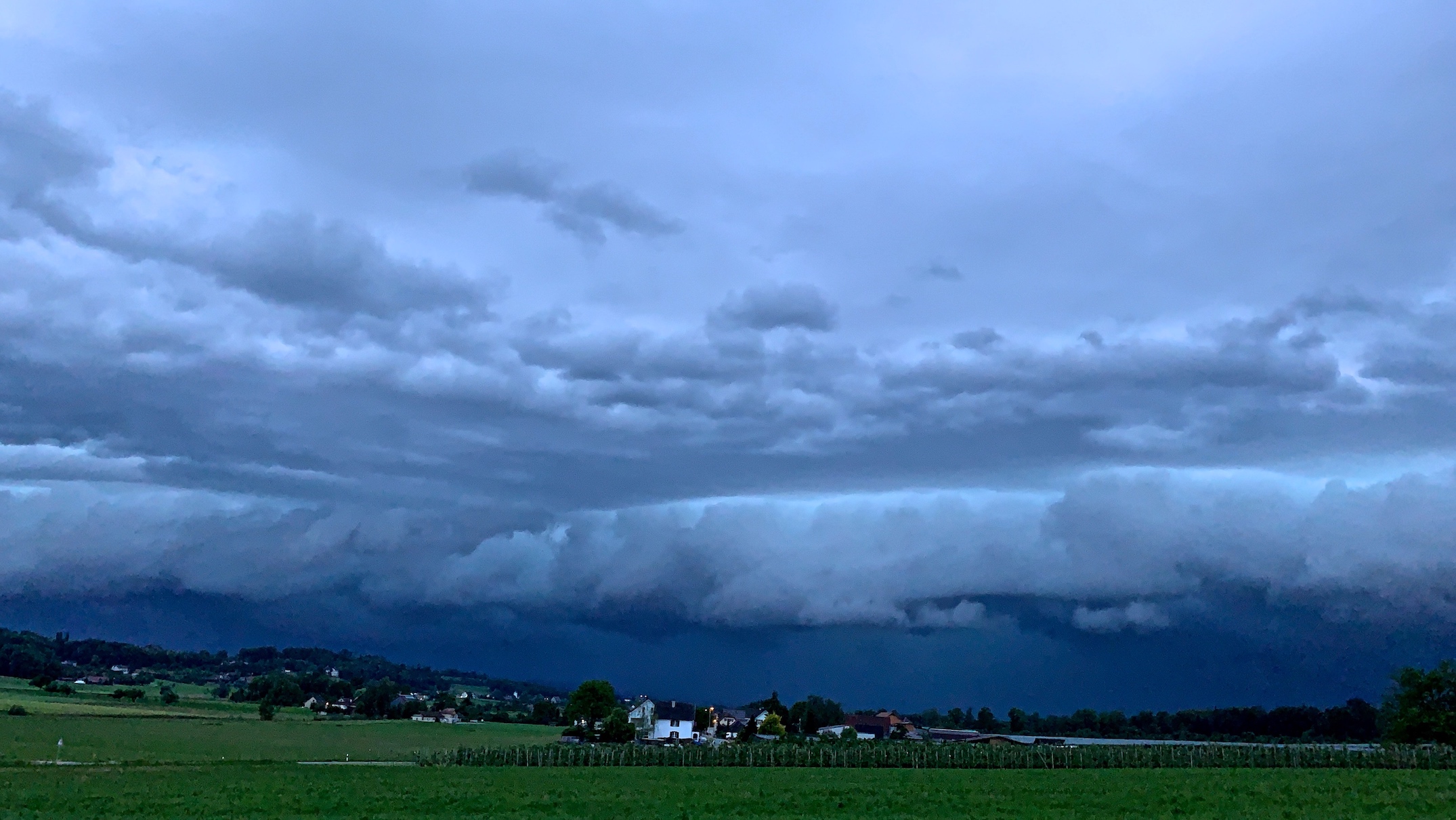 Wir wurden etwas südlich von Stockach von der Bodensee-Superzelle überrollt und hatten einen Superblick zu deren Kern genau vor uns, der heftig rotierte und die Fraktusfetzen zyklonal auf und ab tanzten (siehe Bildmitte). Selten in der Schweiz erlebt, solche Strukturen. Saftige Windböen, aber keinen Hagel (zog südlich an uns vorbei), Starkniederschlag und viele eingelagerte Blitze...; Bombenstimmung! Unter dem Böenkragen hing eine der schönsten Scudclouds (Böenfrontwirbel), die ich je gesehen hatte. Leider ist es keine Funnelcloud, auch wenn die Form zunächst auf eine schliessen würde.