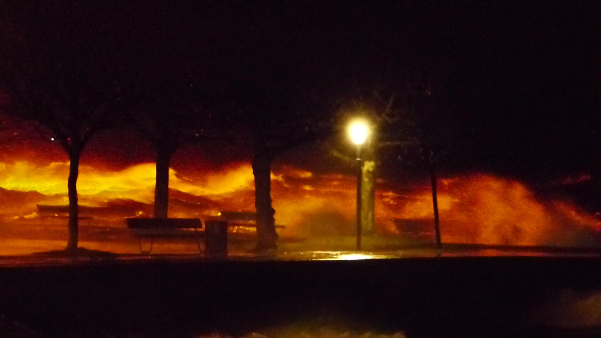Dieses Bild ist ein Frame aus einem Video. Als Lichtquelle dient die Sturmwarnung. Darum sieht es so aus als ob der Zugersee in Flammen stünde.