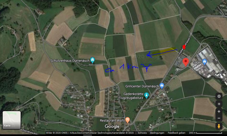 Hier noch eine selbstgebastelte Grafik mit meinem Standort auf der Hallwilstrasse (roter Punkt) und der Blickrichtung. Die Distanz ist schwer einzuschätzen; es könnte aber doch mehr als 1 km gewesen sein (also links vom Bildrand..)