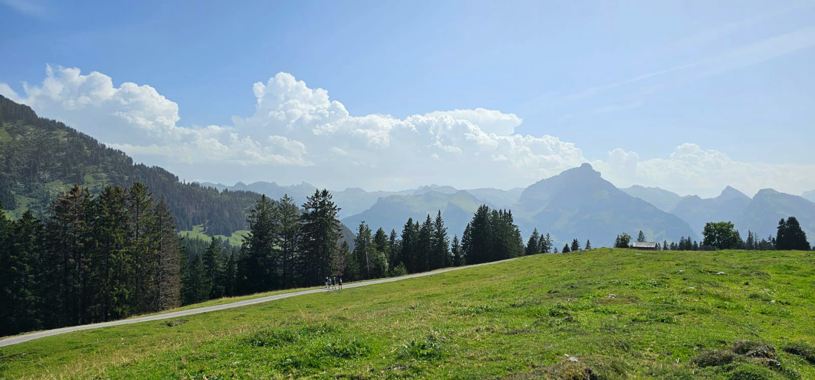 Danach im Rheintal zurück nach Norden, wo sich vom Alpstein herkommend rasch eine Linie mit Gewittern bildet. Dies der Anblick von Rankweil Richtung Säntis und hoher Kasten. Hagelstreifen?