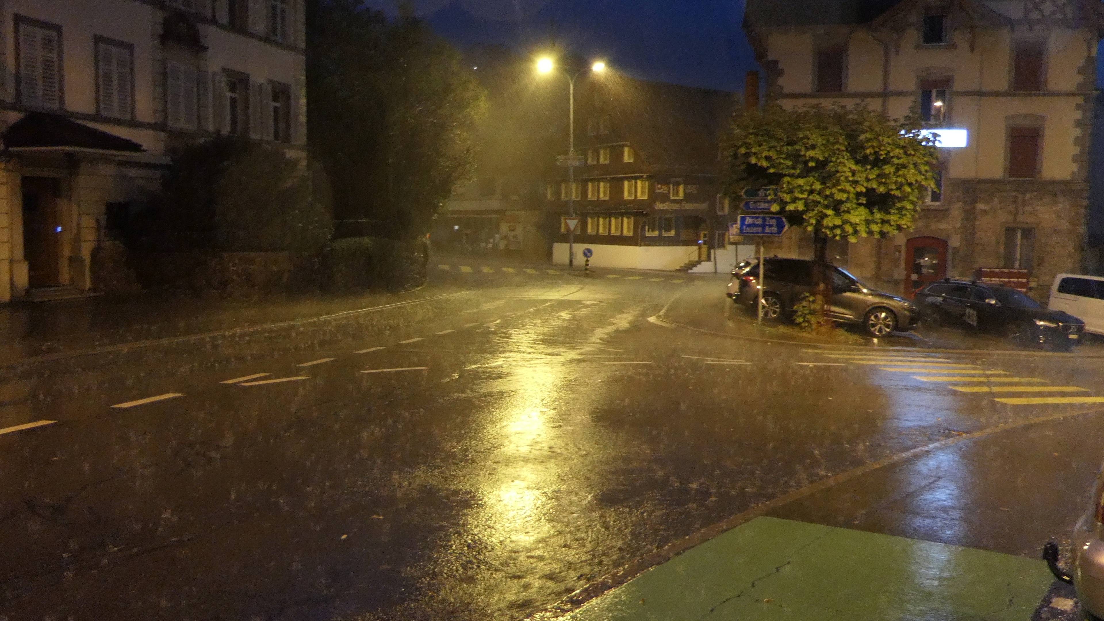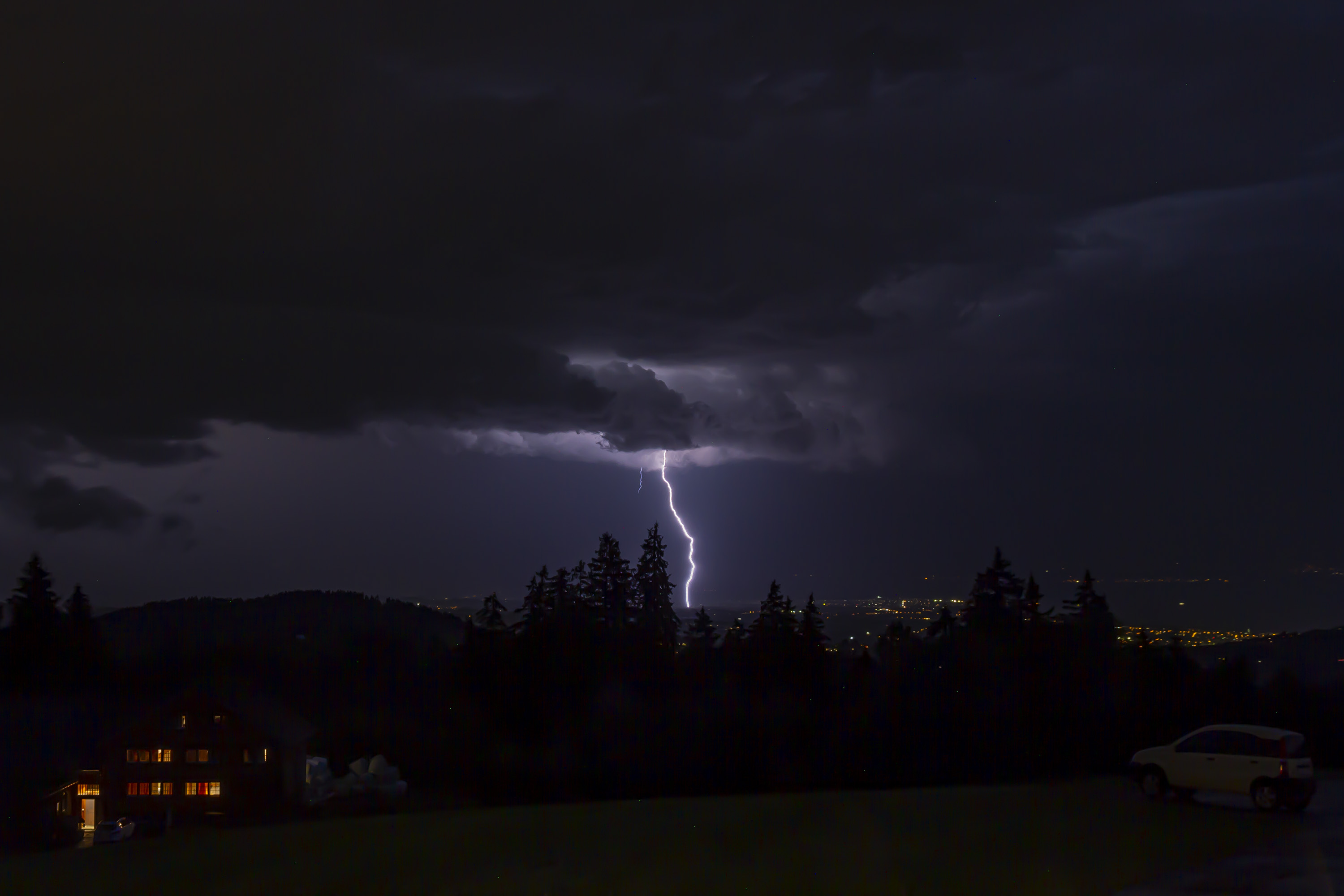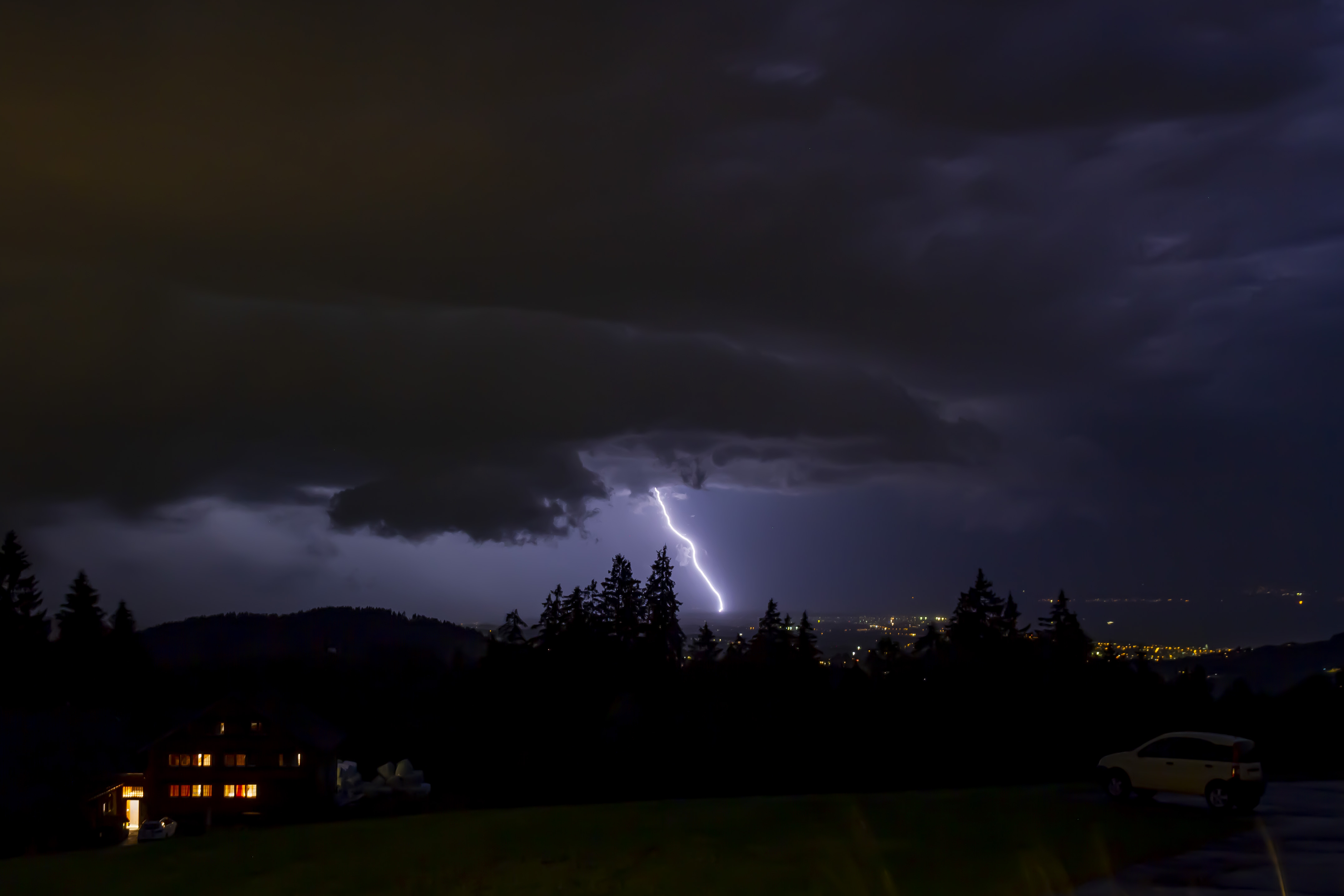 Schliesslich kommt von Westen her noch die allseits bekannte Mittelland-Front und bringt Hochfrequenz-Geblitze der besseren Sorte. Auch einige Erdblitze waren dabei. Es blieb nur sehr wenig Zeit ohne Regen zwischen den Gewitterschüben, aber es gelangen noch zwei mit der guten Kamera:
