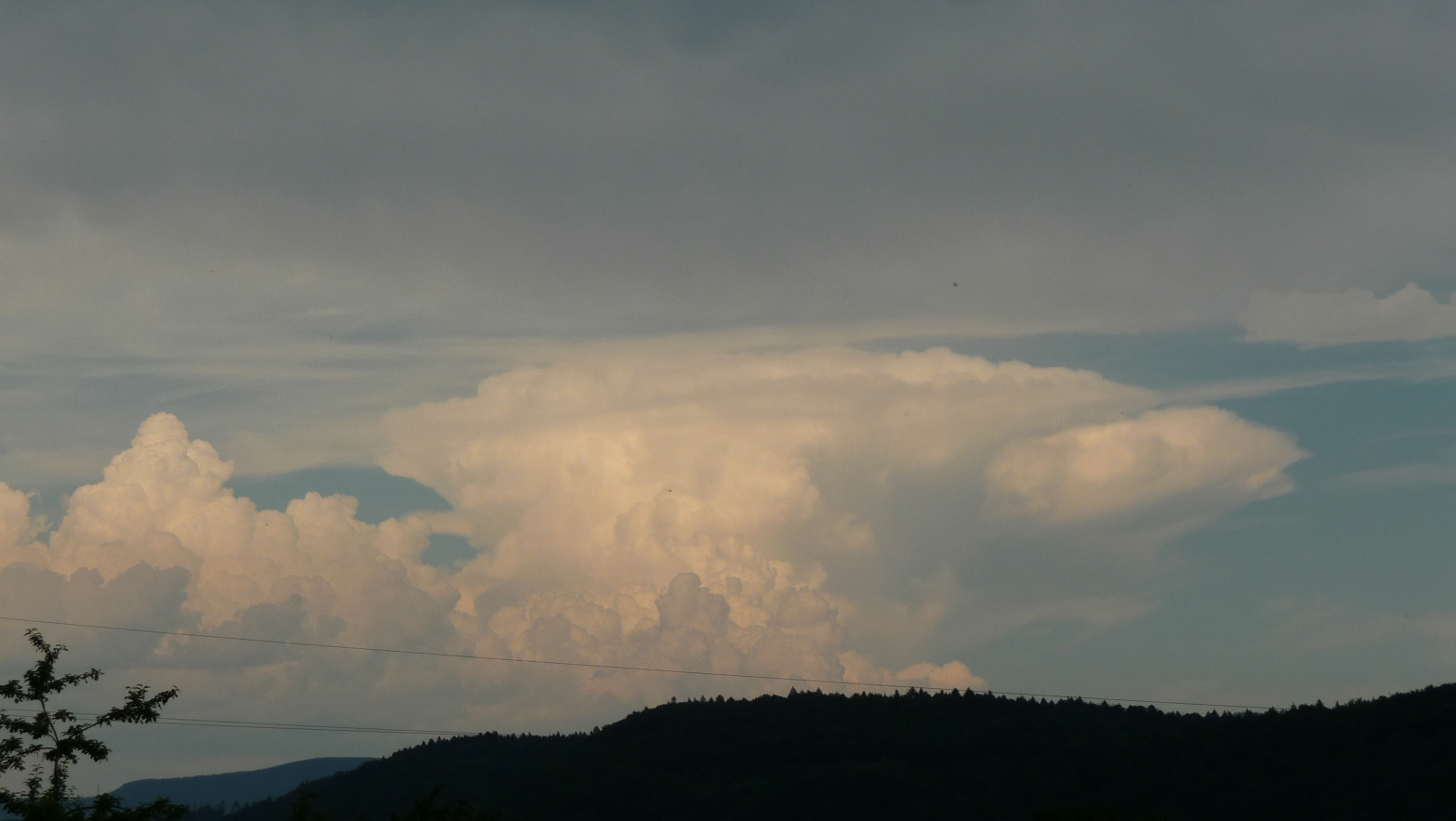 Und dann: nicht mal ein Tropfen (anscheindend ist wirklich alles über unseren Köpfen verdunstet). Dafür gabs unter dem Schirm noch einen schönen Blick nach Nord-Osten (kleinere Zelle im Donautal):