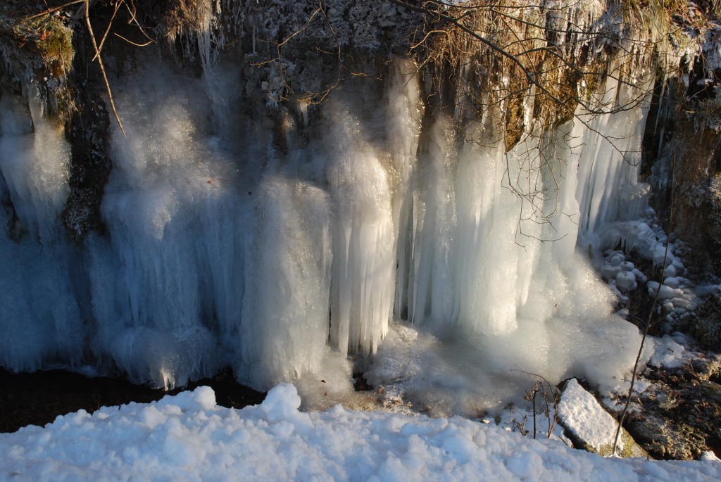 Hier war es mit einer Tmax von 0,8°C auch recht mild. Gestern Morgen hatten wir -7°C, währenddem es im Tal Richtung Langnau bis -15°C war :shock: . Kein Wunder ist an den Eisskulpturen noch nicht grosses Tauwetter zu erahnen: