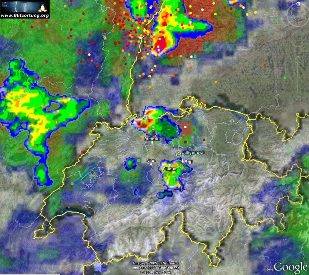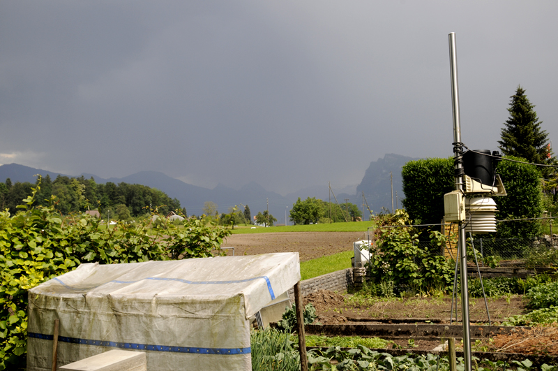 Wir wurden mit einigen Regentropfen von der Zelle beglückt, die südlich Richtung Rigi und Bürgenstock vorbeigezogen ist. Hier der Blick vom Nordwestlichen Rand der Zelle: