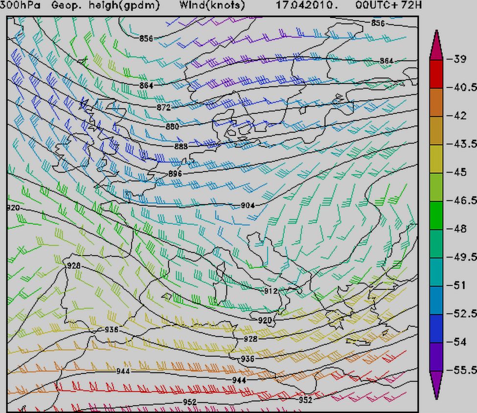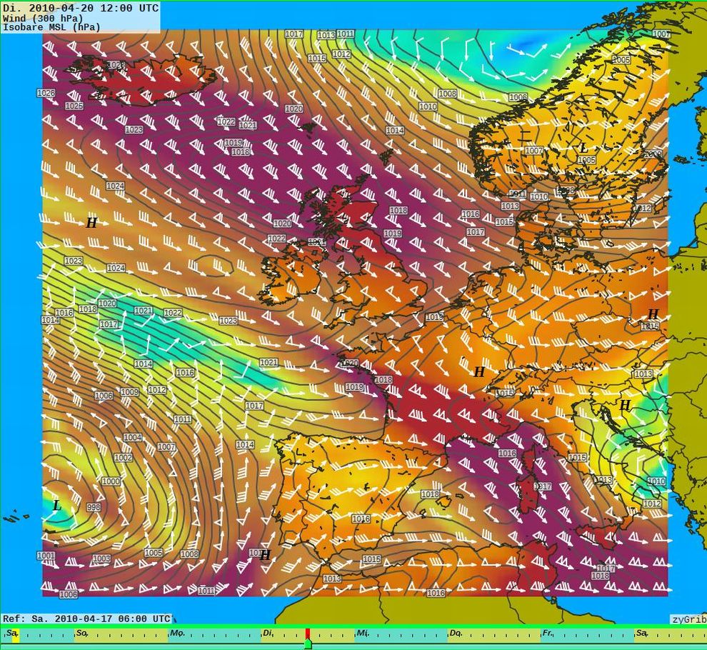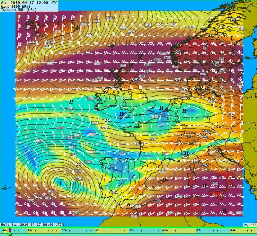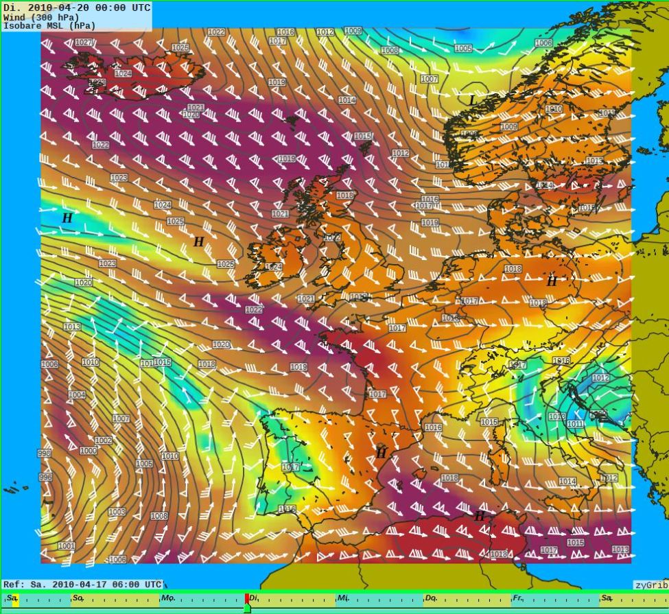 Feinstaubvorhersage für Europa nach dem Vulkanausbruch in Island am 14.04.2010. Animationen in ca. 5 km Höhe. Kontinuierliche Emissionen vom 14.04.2010 06 UTC. Wegen Unsicherheiten der tatsächlichen Emissionsstärke, können die dargestellten Konzentrationen von den beobachteten abweichen.