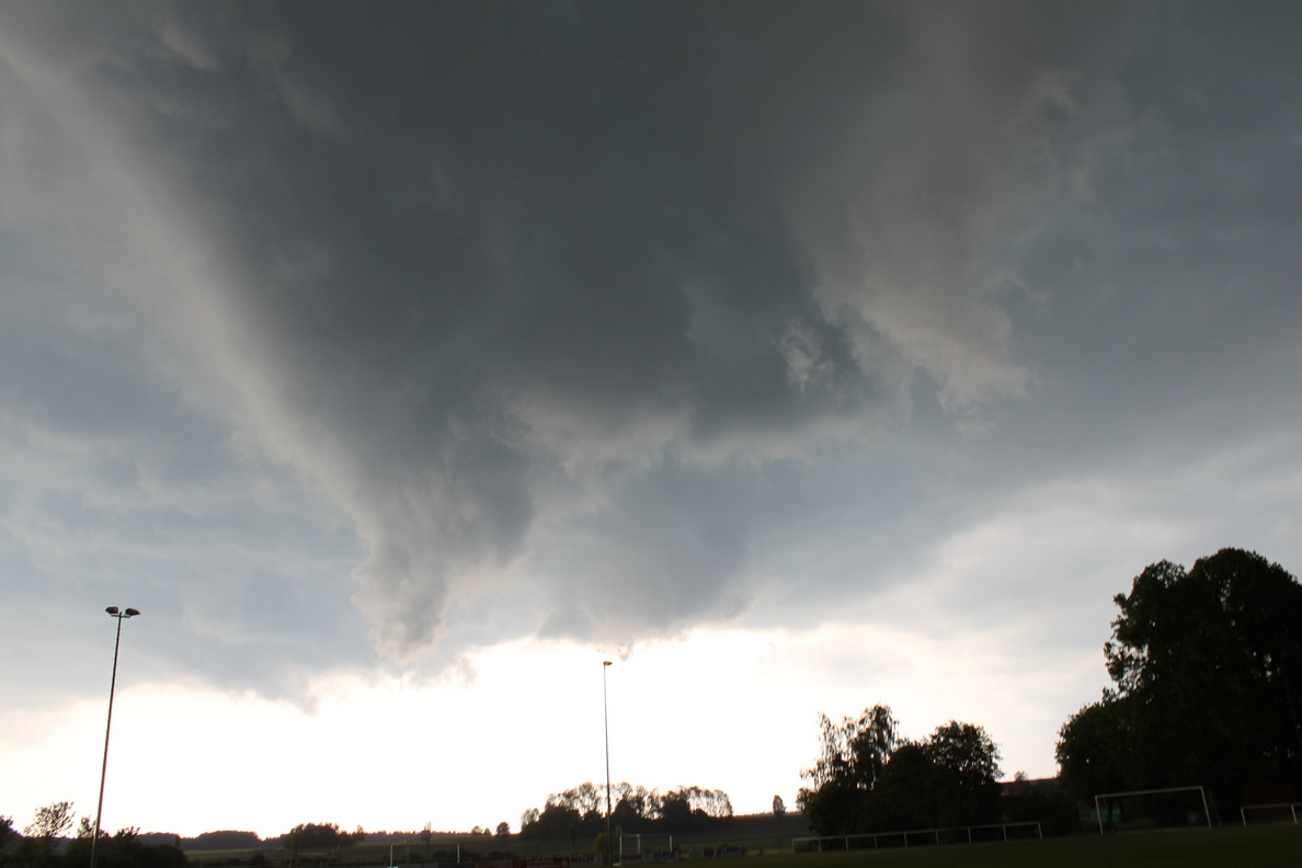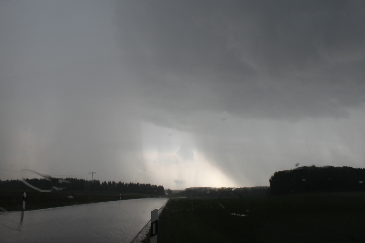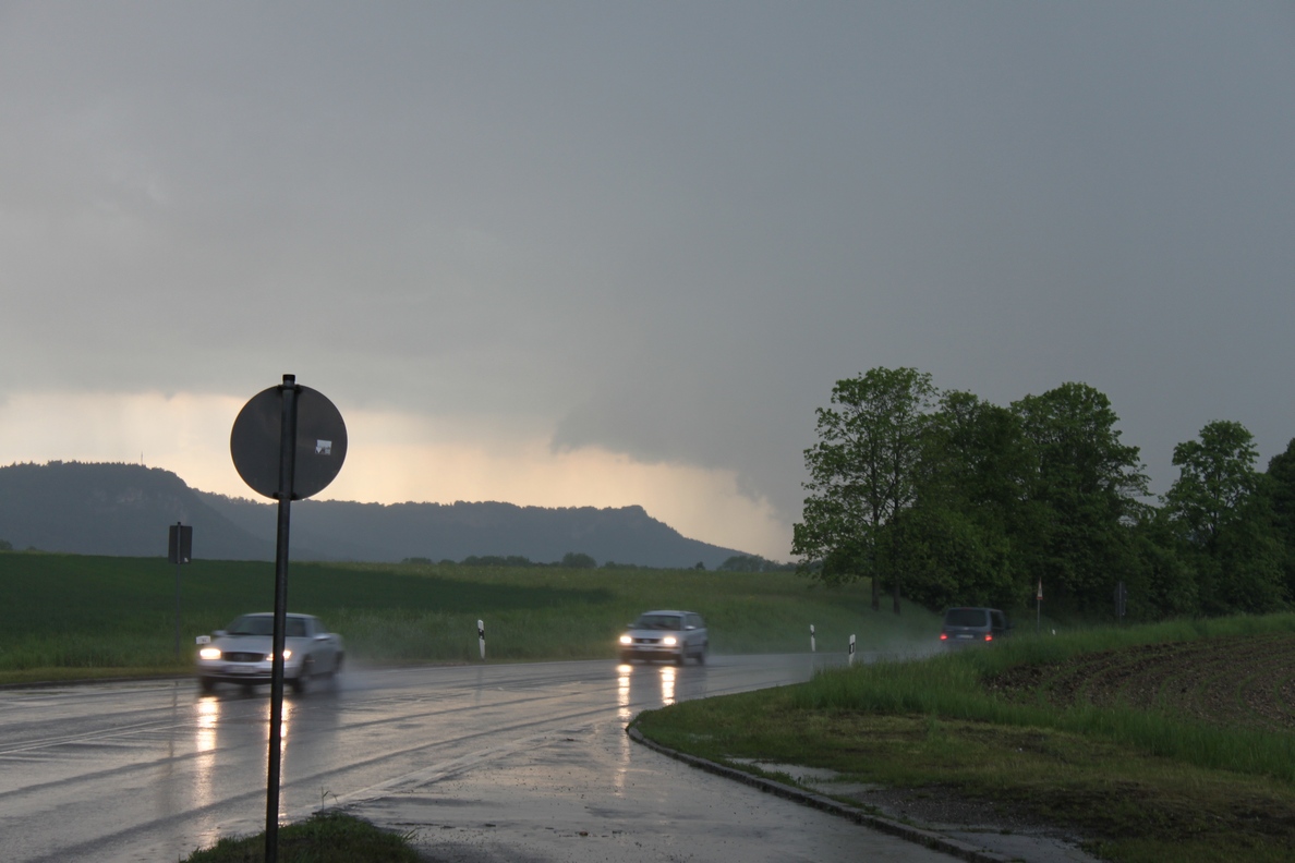 Allerdings war das alles nichts spezielles und zudem meist recht unfotogen. Weiter nördlich schien an diesem Tag einfach nichts zu wollen und ich beschloss weiter nach Süden Richtung Oberschwaben zu fahren. Im Speziellen fasste ich die Zelle an der Donau ins Auge, welche sich auf ihrem Kurs nach SW weiter zu verstärken schien. Bei Sigmaringen merkte ich dann aber, dass es im Vorfeld der Zelle plötzlich kräfige Neuentwicklungen an der südlichen Albkante gab. Ich kehrte um und fuhr wieder etwas weiter nach Norden (Ziel: Inneringen). Bereits unterwegs kam ich in dichteren Hagel (1-1.5 cm). Da Fahren nicht mehr so ideal war, wartete ich das Gröbste ab, wollte danach aber weiter nach Norden, da auch dieser Aufzug eher unfotogen war. In Inneringen angekommen bot sich dann gottseidank ein anderes Bild: Über mir befand sich eine tiefe Wolkenabsenkung, welche eindeutig leichte Rotation aufwies. Über das warum kann ich ähnlich wie Benni/Thies nur spekulieren: Das Scherungsprofil für Superzellen war eindeutig nicht gegeben. Muss sich um orografische Effekte bei der vermutlich outflow-getriggerten Auslöse gehandelt haben. Ne klassische SZ wars aber definitiv nicht! Ich konnte die Absenkung knapp 10 min. verfolgen. Hier ein paar Bilder: