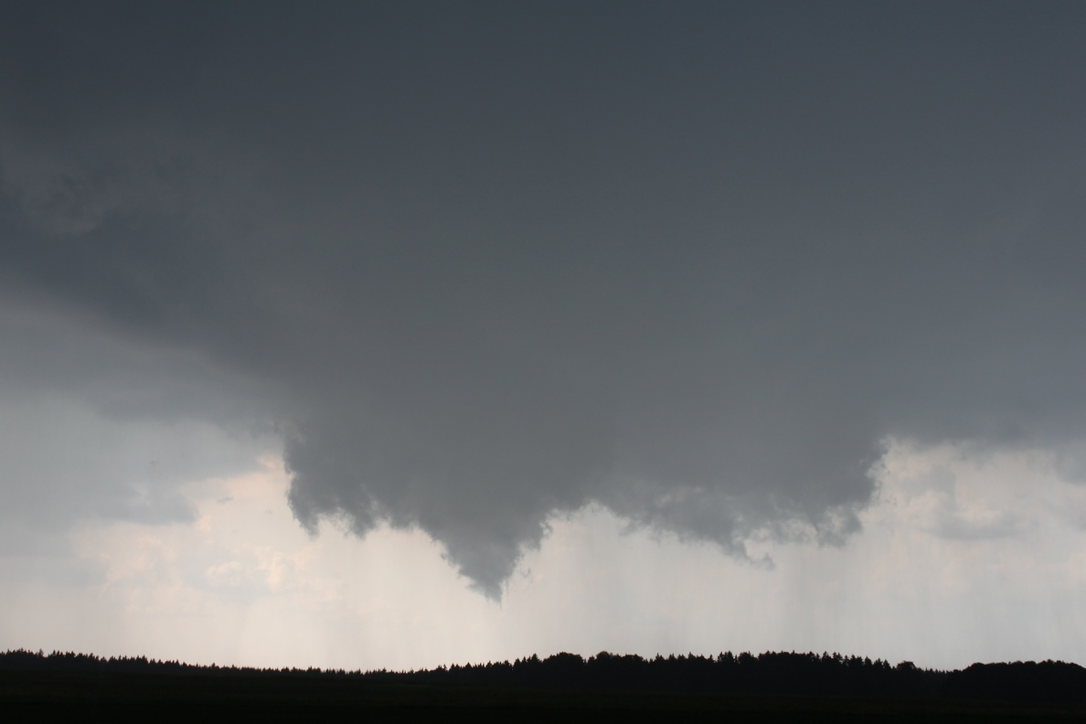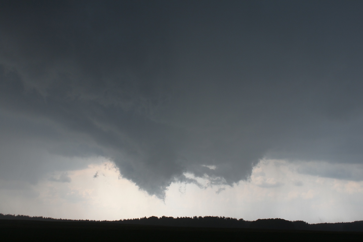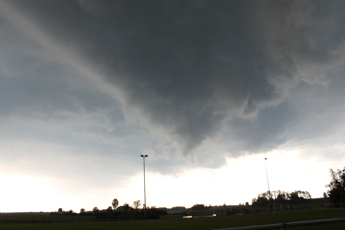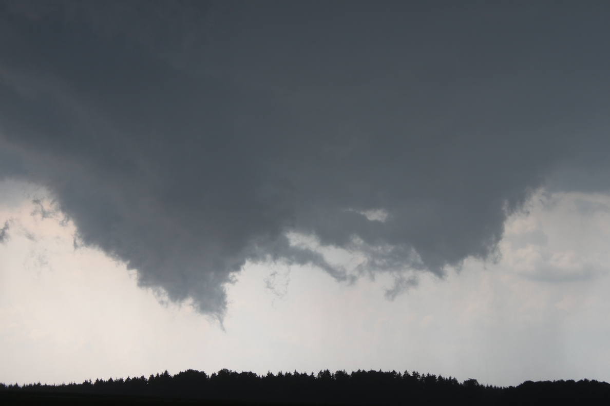 Allerdings war das alles nichts spezielles und zudem meist recht unfotogen. Weiter nördlich schien an diesem Tag einfach nichts zu wollen und ich beschloss weiter nach Süden Richtung Oberschwaben zu fahren. Im Speziellen fasste ich die Zelle an der Donau ins Auge, welche sich auf ihrem Kurs nach SW weiter zu verstärken schien. Bei Sigmaringen merkte ich dann aber, dass es im Vorfeld der Zelle plötzlich kräfige Neuentwicklungen an der südlichen Albkante gab. Ich kehrte um und fuhr wieder etwas weiter nach Norden (Ziel: Inneringen). Bereits unterwegs kam ich in dichteren Hagel (1-1.5 cm). Da Fahren nicht mehr so ideal war, wartete ich das Gröbste ab, wollte danach aber weiter nach Norden, da auch dieser Aufzug eher unfotogen war. In Inneringen angekommen bot sich dann gottseidank ein anderes Bild: Über mir befand sich eine tiefe Wolkenabsenkung, welche eindeutig leichte Rotation aufwies. Über das warum kann ich ähnlich wie Benni/Thies nur spekulieren: Das Scherungsprofil für Superzellen war eindeutig nicht gegeben. Muss sich um orografische Effekte bei der vermutlich outflow-getriggerten Auslöse gehandelt haben. Ne klassische SZ wars aber definitiv nicht! Ich konnte die Absenkung knapp 10 min. verfolgen. Hier ein paar Bilder: