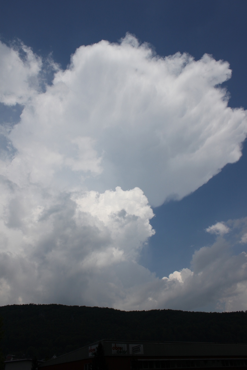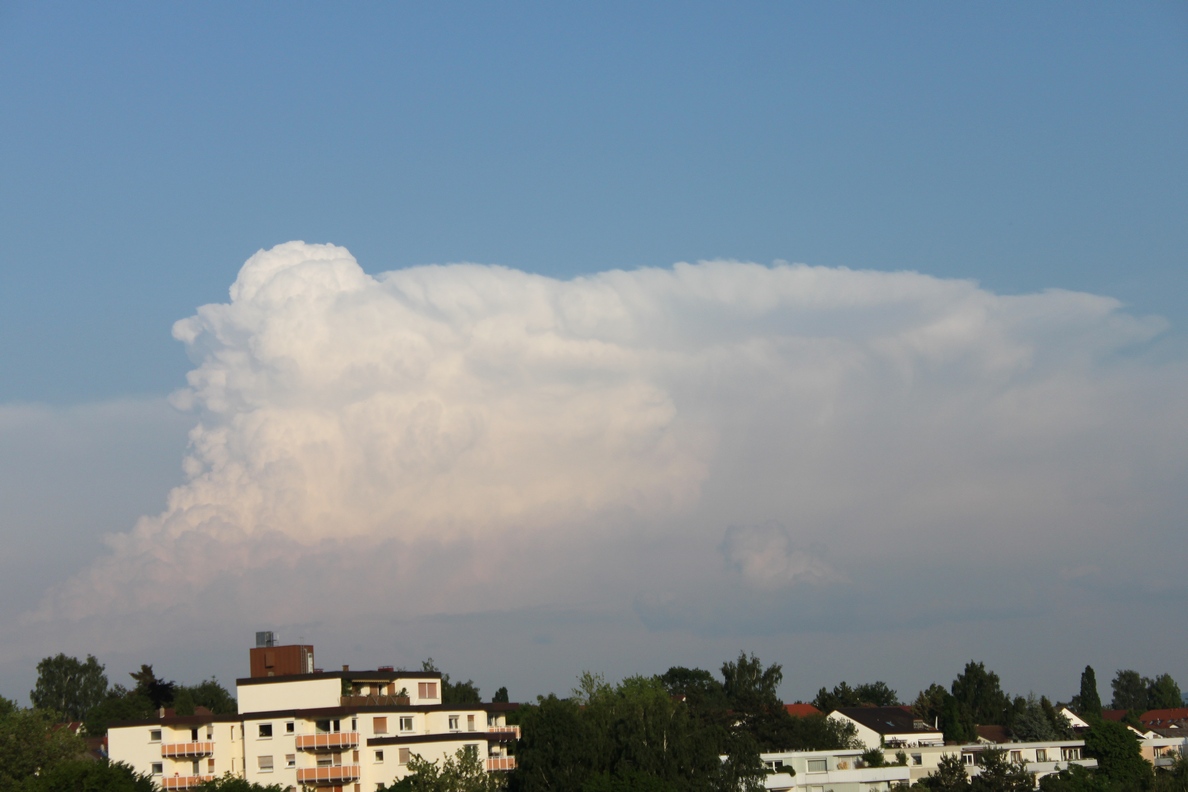 Leider kam ich dann kurz vor Balingen in einen unfallbedingten Stau und es ging für gute 45 min. nichts mehr. Dadurch verpasste ich die Zelle leider, welche dann Richtung Schwarzwald-Baar-Kreis zog und dort das 3. gröbere Gewitter mit Hagel an diesem Tag brachte. Der Jagt war ein Ende gesetzt und ich fuhr zurück wo ich sah, dass sich an der Donau (Richtung Ulm) erneut eine gesunde Zelle mit overshooting-top entwickelt hatte: