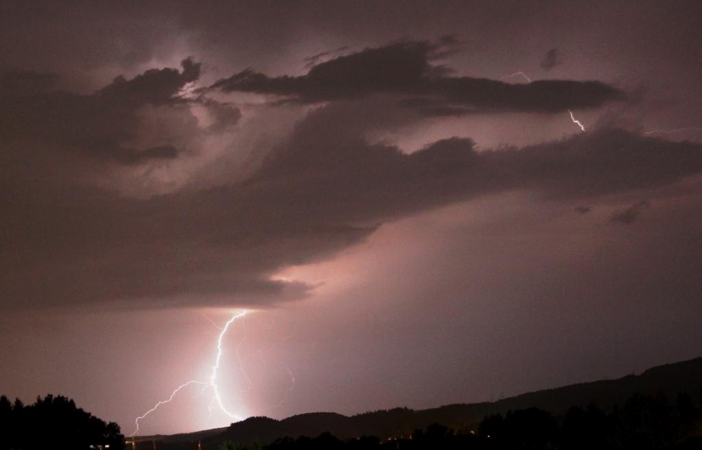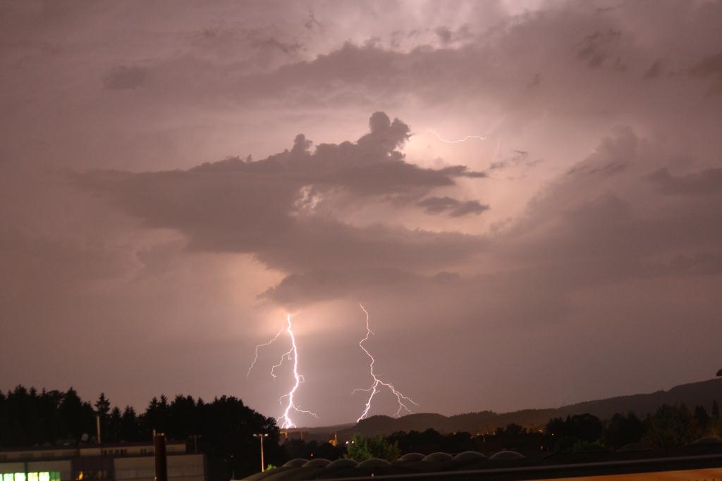 Wieder zuhause, schaute ich bis Mitternacht etwa alle 15 Minuten aufs Radar, ehe ich ins Bett ging. Ich war nicht eine Minute im Näscht, bollerte der erste Donner. Sofort wieder auf den Beinen stellte ich auf dem Balkon die Kamera auf und konnte ein kurzes, nicht sehr starkes Gewitter geniessen. Das ganze ging so schnell, dass eigentlich alle Tools (Radar, Sat-Bild usw.) aufgrund ihrer Zeitverzögerung nutzlos waren. So hatte ich auch keine Zeit, noch schnell auf eine Anhöhe zu gehen, wovon ich einen ansprechenderen Vordergrund für die Blitzfotos gehabt hätte...
