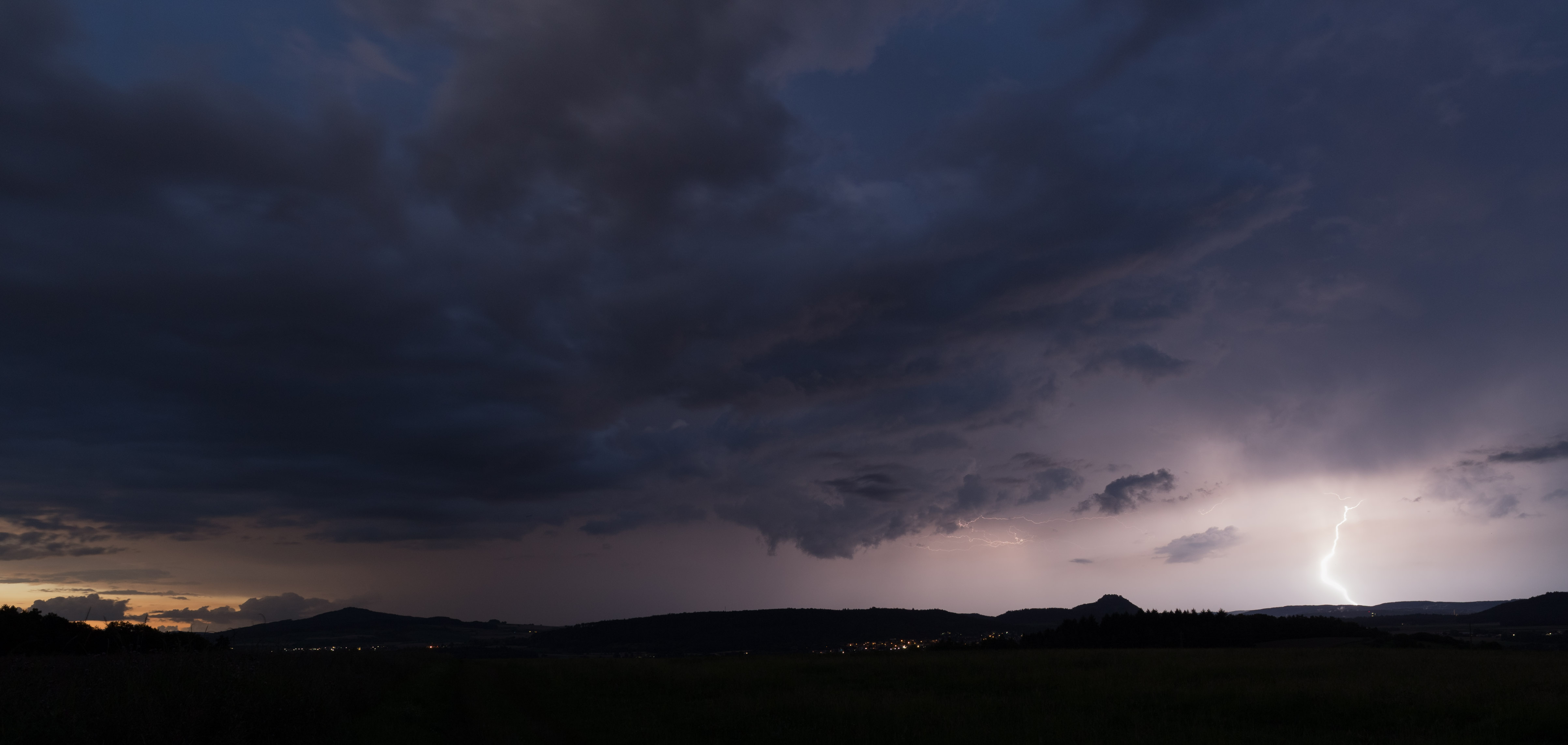 Hier noch eine Aufnahme vom Gewitter über dem Hegau, welches über Engen richtung Bodensee gezogen ist. Standort oberhalb Randegg, Blick richtung Singen, Aufnahmezeit ist 21:54h, vielleicht einer von Brösmelis Naheinschlägen. :mrgreen: