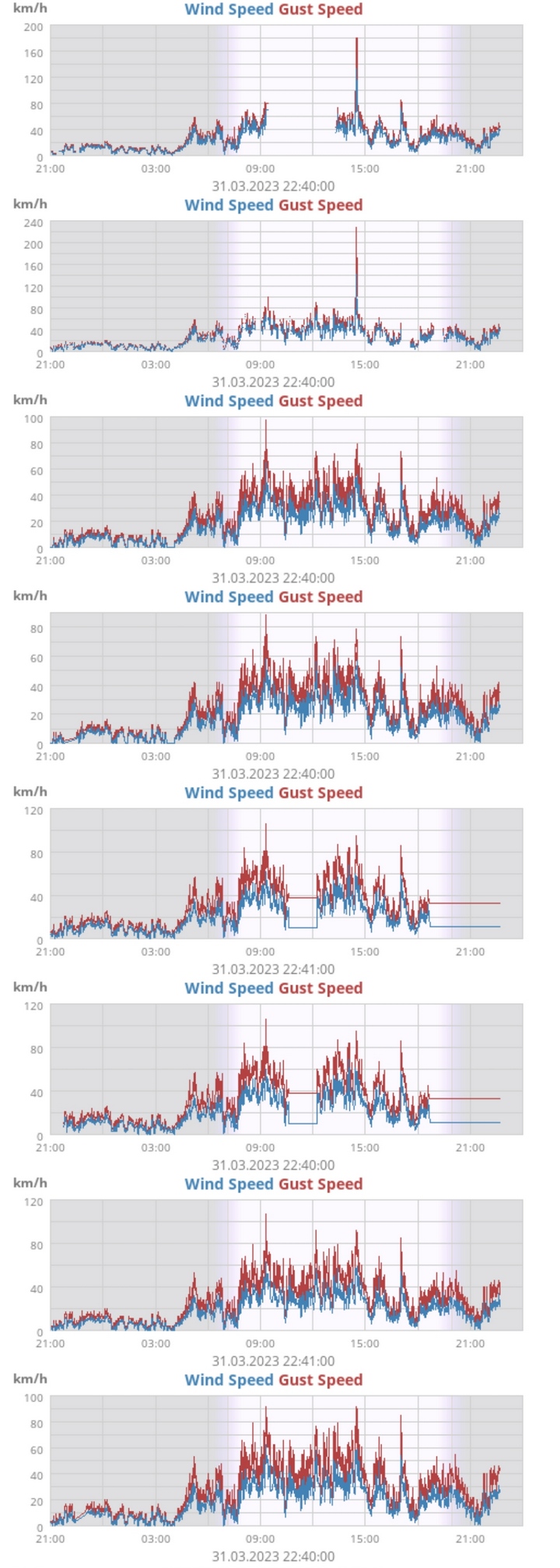 Zum Glück habe ich am selben Mast noch ein zweites Anemometer, bzw. eine zweite Station eines anderen Herstellers...Moment mal: