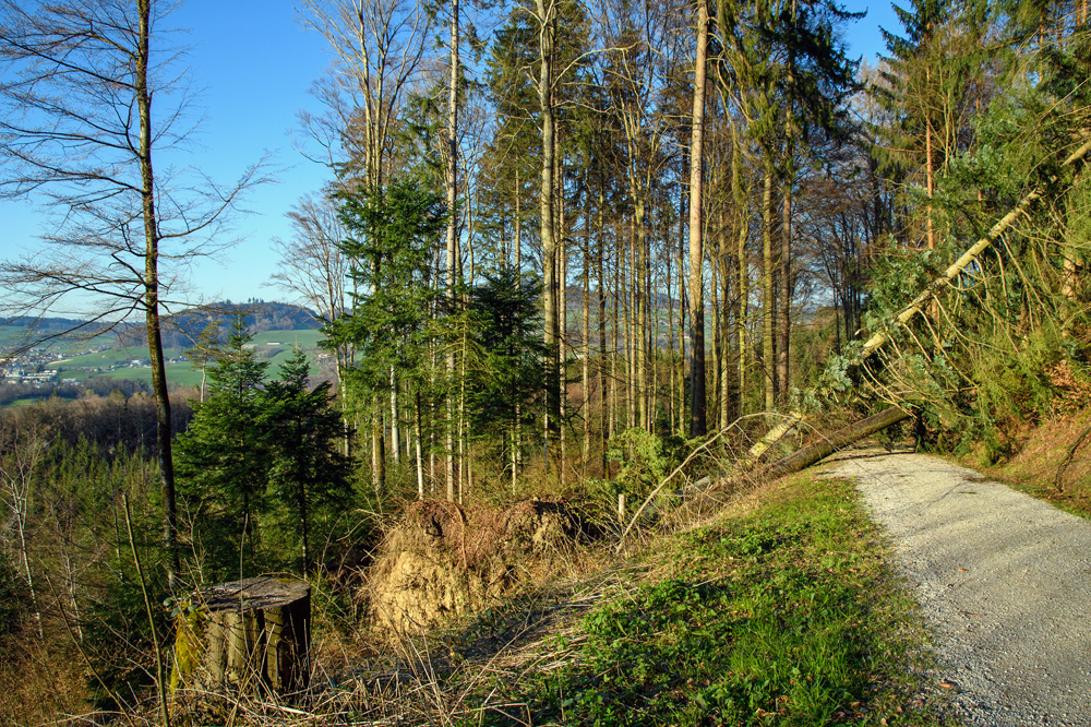Das Schadensgebiet ist relativ klein, es hat aber mächtige Bäume erwischt, von denen die meisten auf den Forstweg gefallen sind.